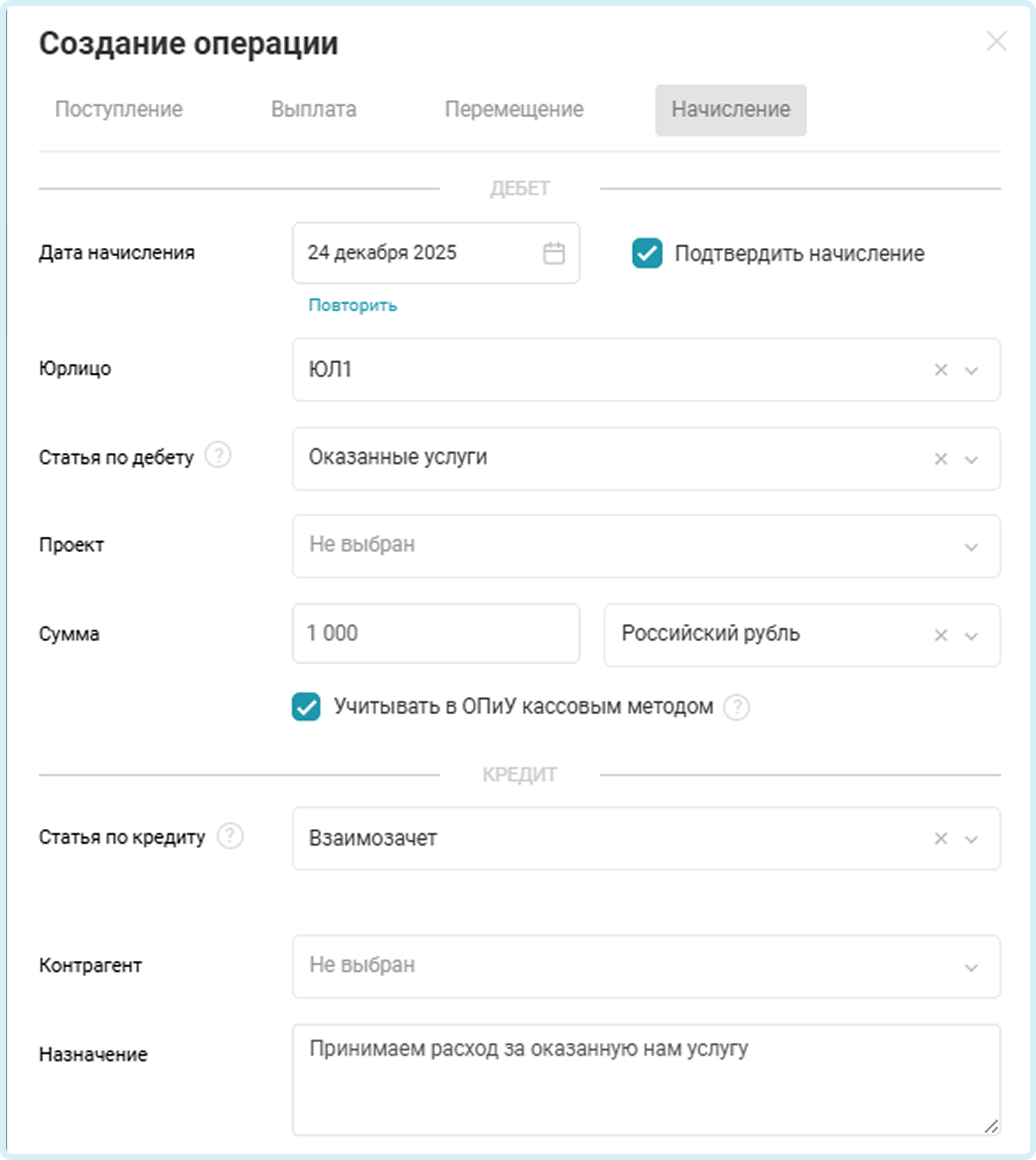 2. Принимаем расход за оказанную нам услугу. Создайте операцию Начисление на сумму 1000 руб: статья по дебету из раздела Расходы (например, Оказанные услуги), статья по кредиту Взаимозачет.