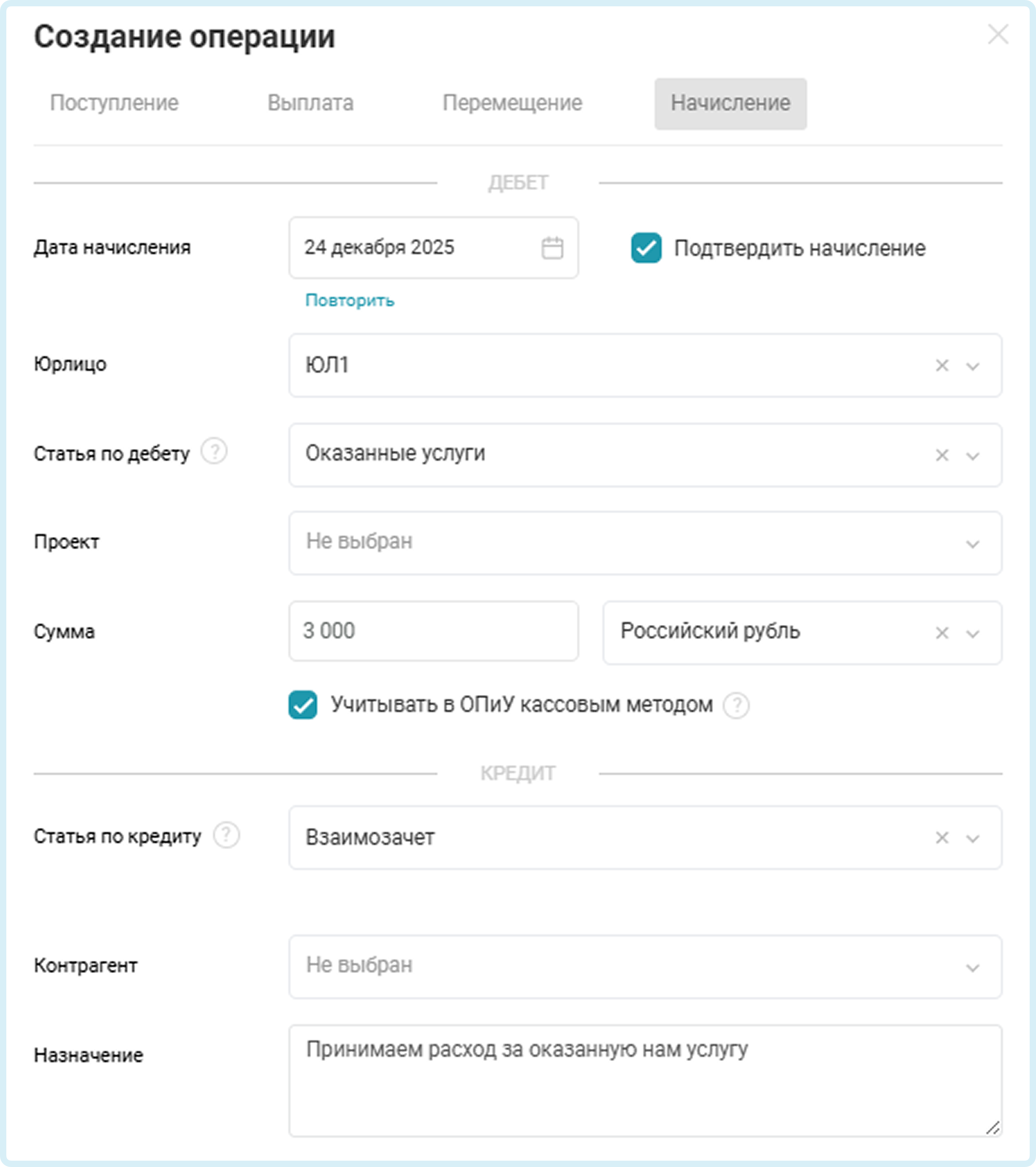 1. Принимаем доход за оказанную услугу. Создайте операцию Начисление на сумму 3000 руб.: статья по дебету Взаимозачет, статья по кредиту из раздела Доходы, например, Оказание услуг.