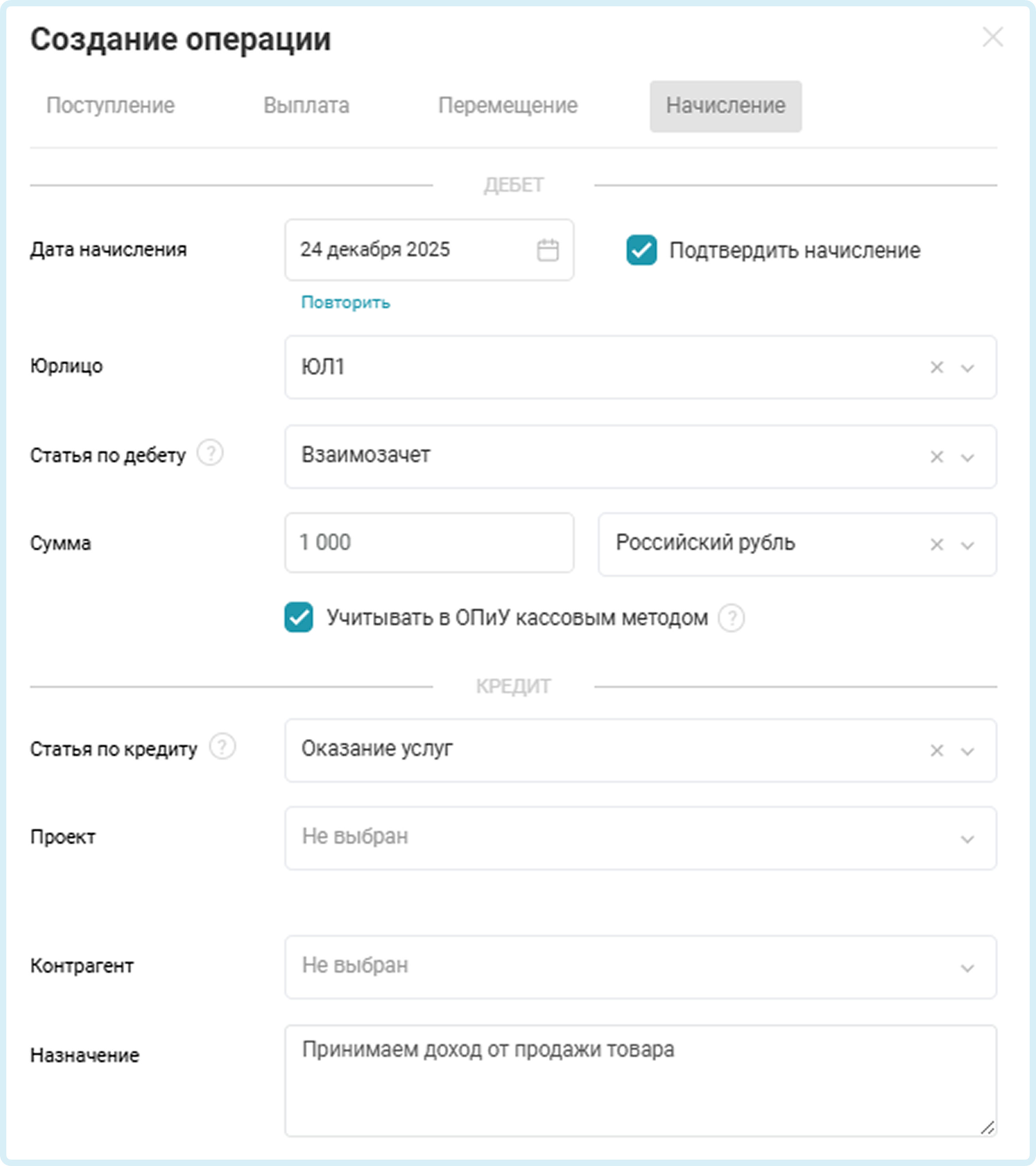 2. Принимаем доход от продажи товара. Создайте операцию Начисление на сумму 1000 руб.: статья по дебету Взаимозачет, статья по кредиту из раздела Доходы, например, Оказание услуг.