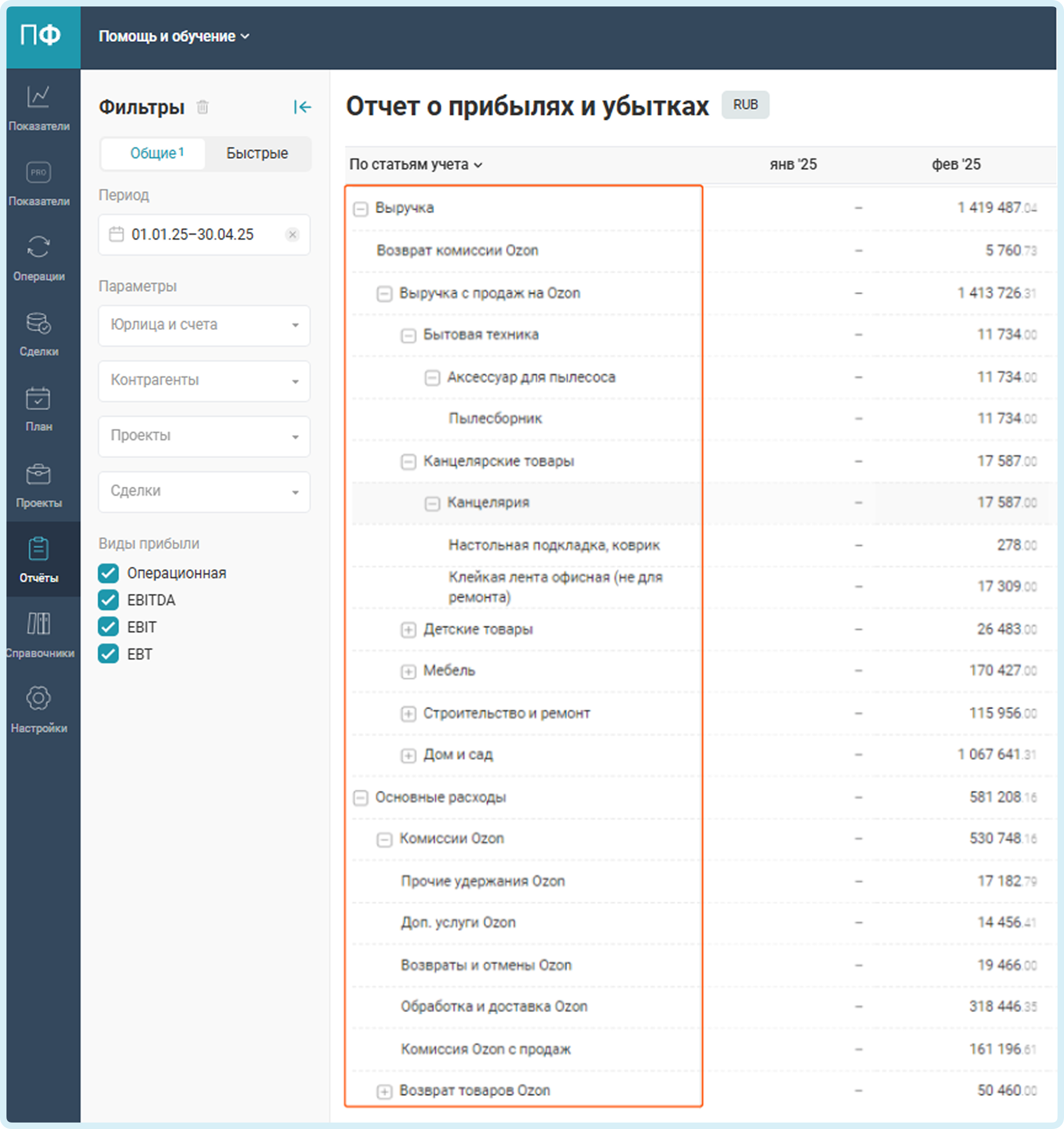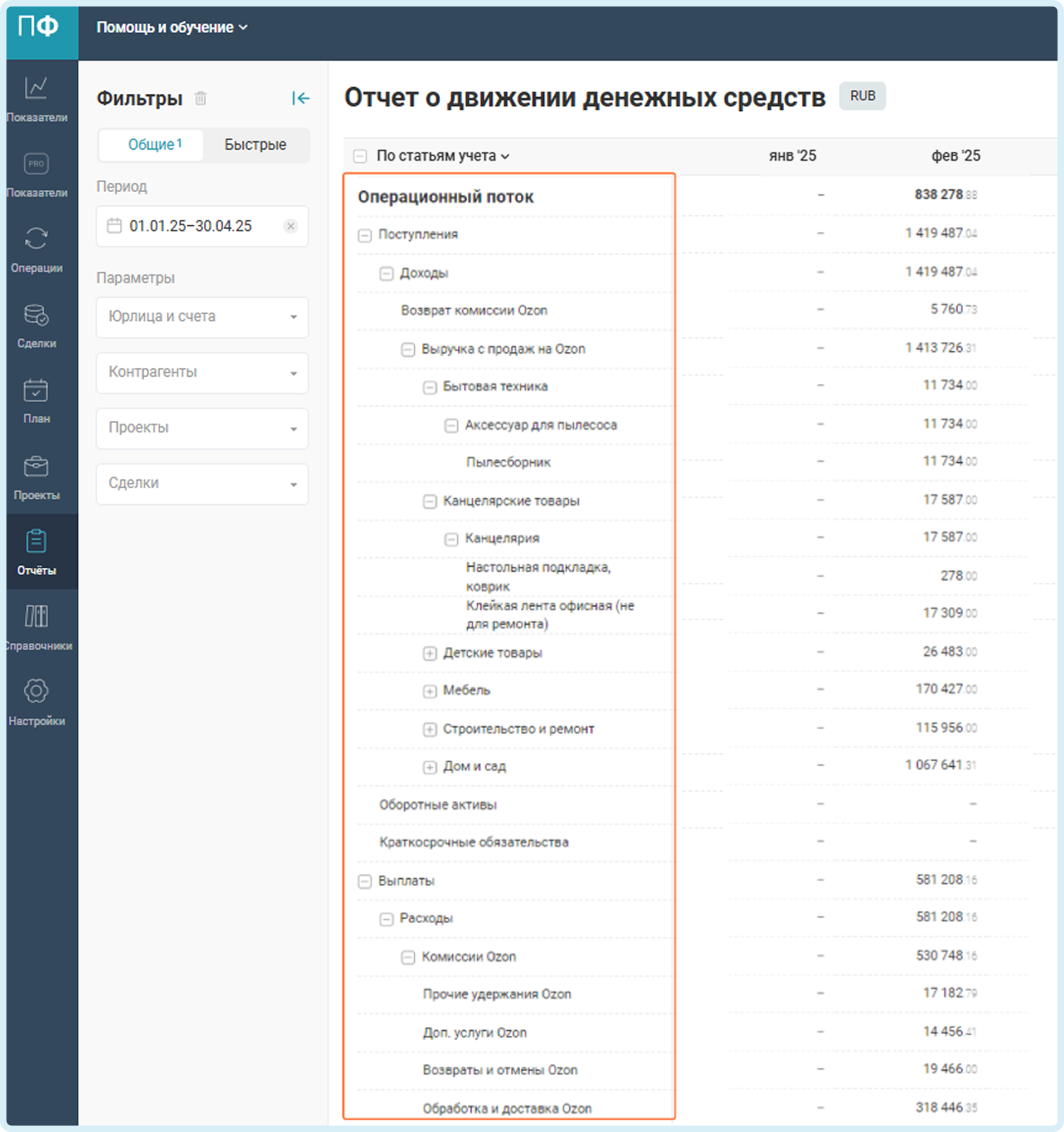 При подключении интеграции у вас создается транзитный счет, на котором отображаются данные о продажах из личного кабинета OZON. Данные по нему отразятся в отчетах: ДДС, ОПУ, Баланс.