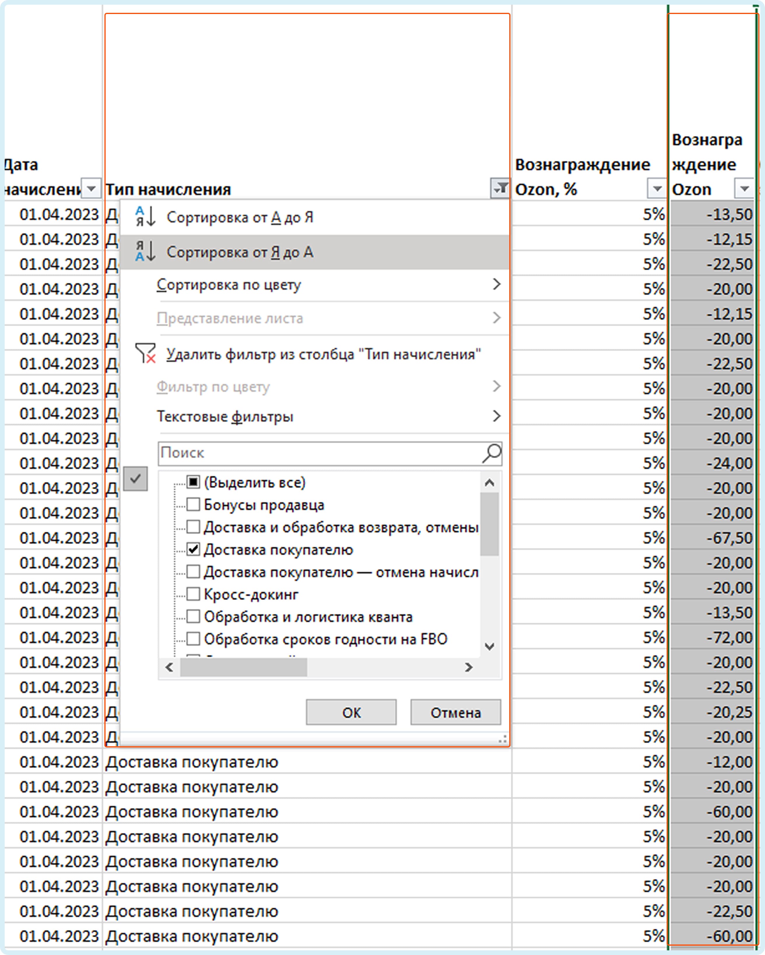 - В Отчете по товарам отфильтруйте данные в столбце Тип начисления - выберите только Доставка покупателю.