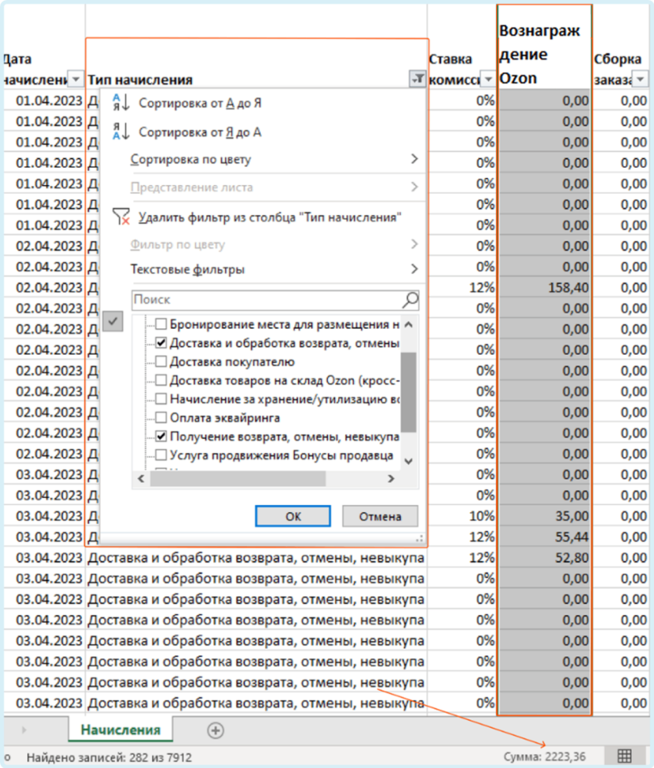 - Сумму комиссии можно проверить по столбцу Вознаграждение Ozon