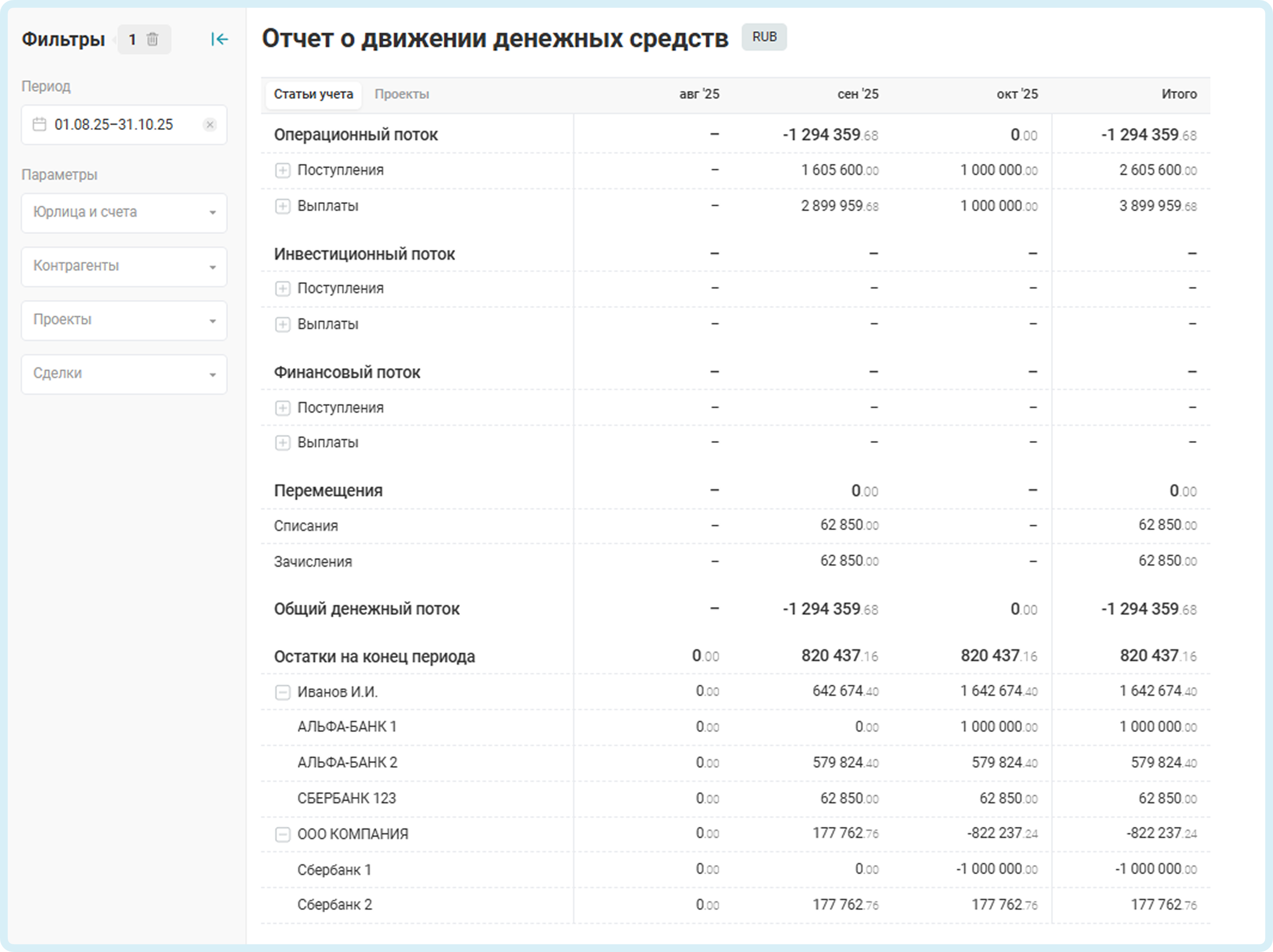 Три потока тесно связаны. Поступления из одного служат источником выплат для другого. Если к остатку на начало периода прибавить общий денежный поток, получим остаток на конец периода.