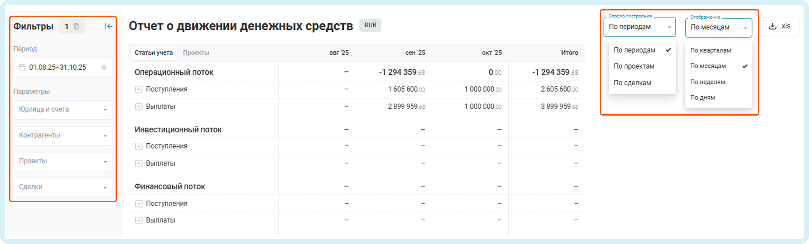 1. По периодам. При построении по периодам вы можете выставить фильтр слева (указать диапазон построения, счет/юрлицо, контрагента и проект/группу проектов) и выбрать отображение По годам, По кварталам, По месяцам, По неделям и По дням. Отображение зависит от выбранного в фильтре слева периода построения отчета.
