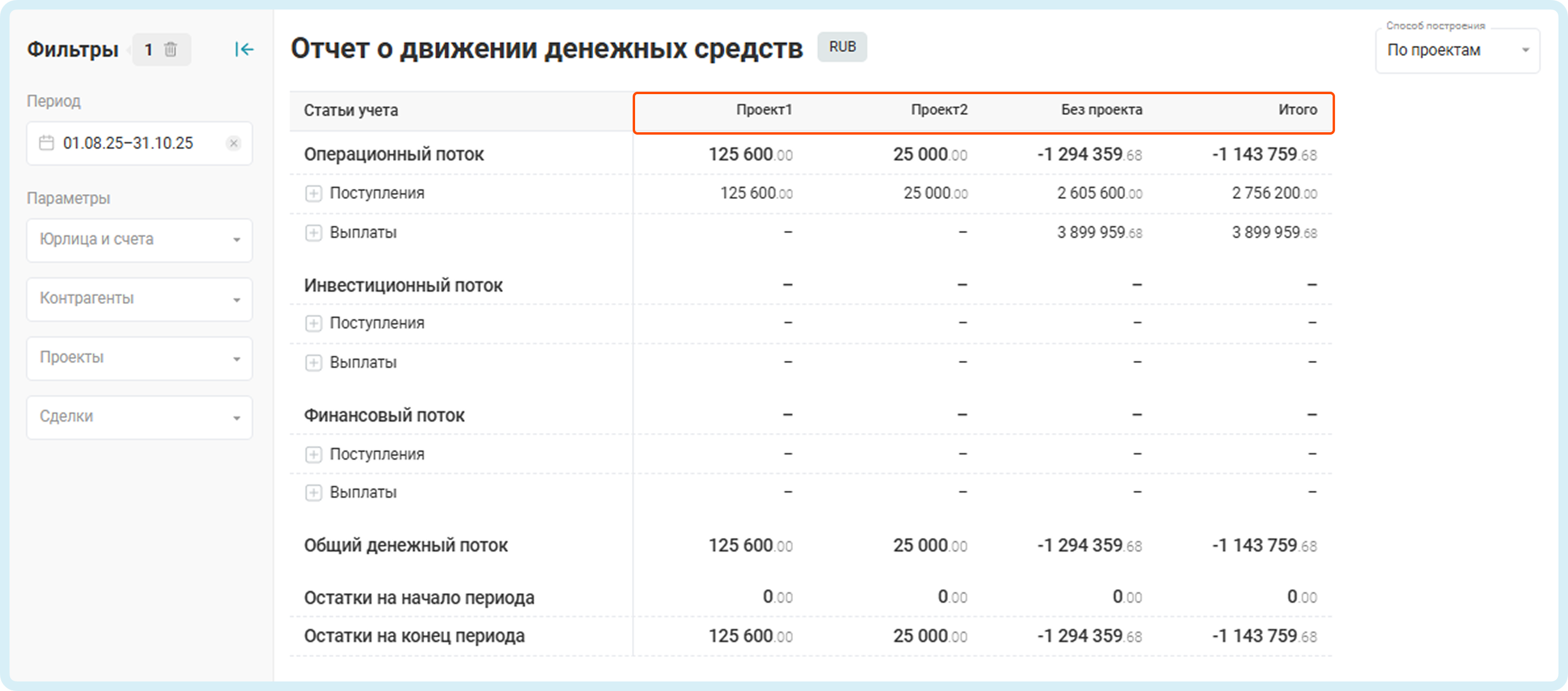 Если в сервисе вы ведете проекты, то при построении отчета данным способом, можно увидеть аналитику в разрезе проектов по указанным в фильтре параметрам. Такое построение покажет разницу между поступлениями и выплатами по каждому из проектов.