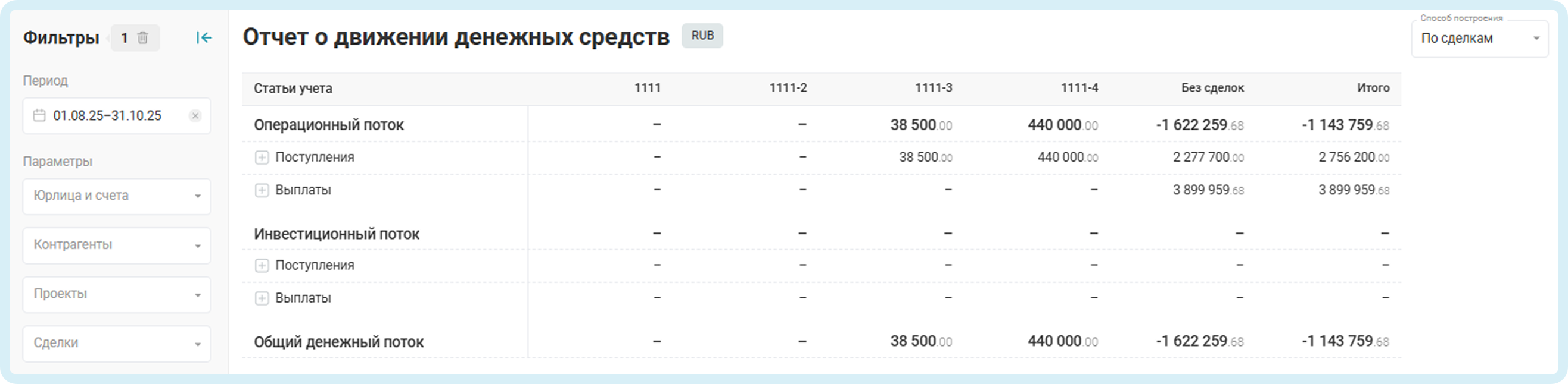 3. По сделкам. Данный способ построения позволит увидеть аналитику в разрезе каждой сделки с разбивкой по статьям учета. Дополнительно можно указать в фильтре необходимые параметры. Сформировав отчет можно оценить движение денег по сделкам.
