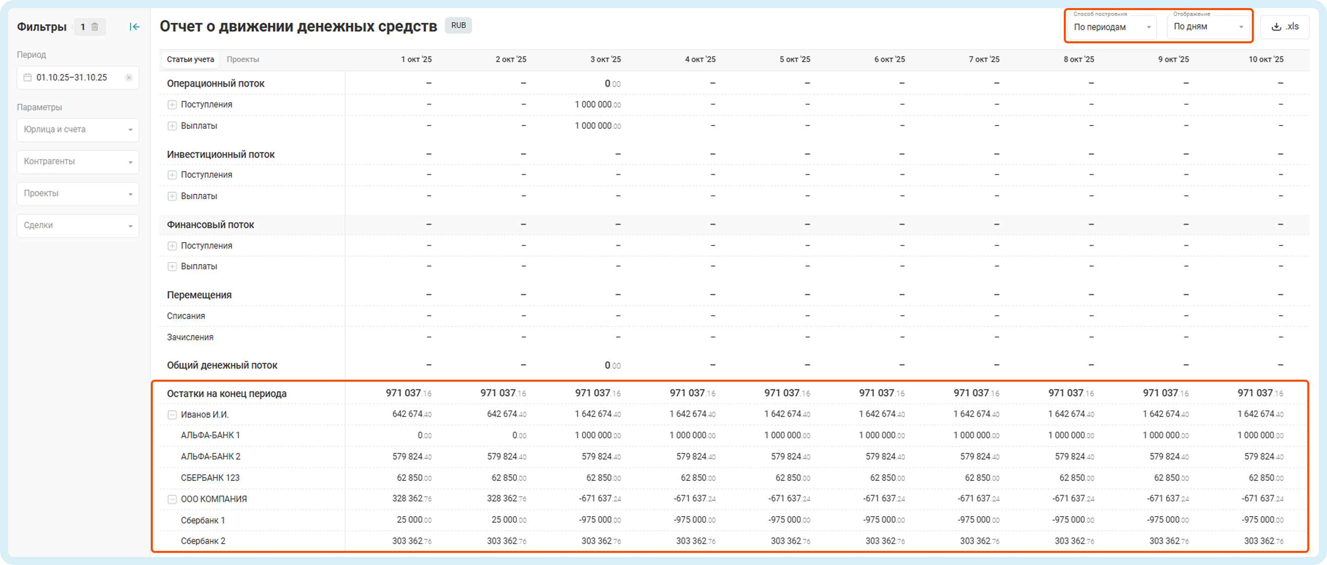 Каждый день собственник должен знать точные остатки на счетах. Тогда он сможет контролировать, хватает ли денег, чтобы со всеми расплатиться. Чтобы увидеть в отчете остаток на любую дату выберите способ построения По периодам, укажите период построения и отображение По дням. В отчете отражается остаток по счету на конец дня.