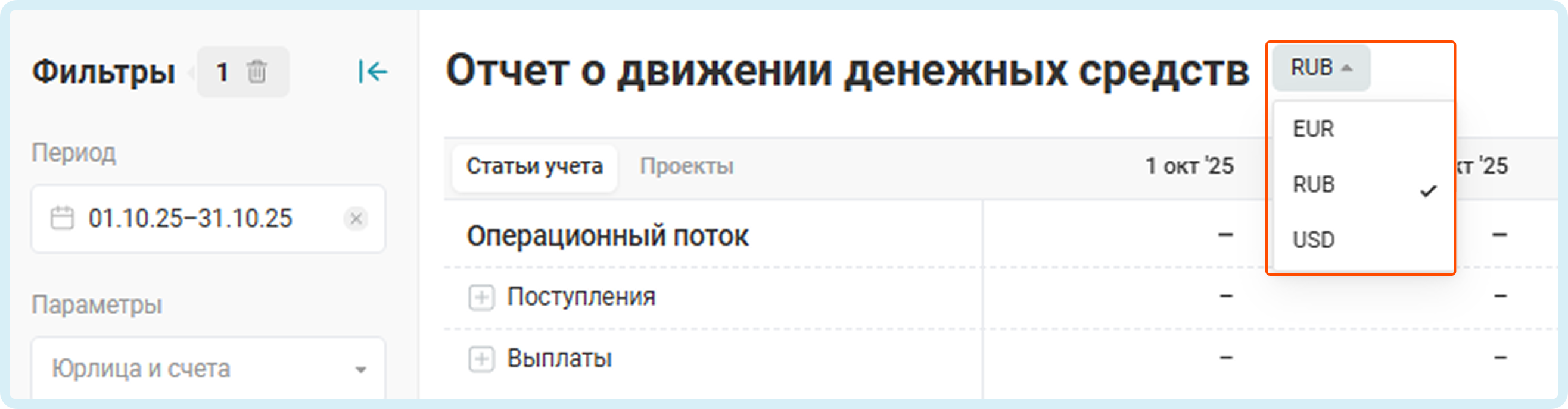 2. Если в аккаунте ведется учет счетов в разной валюте, то отчет по умолчанию строится в валюте аккаунта. Валюту построения ДДС можно изменить в самом отчете. При этом валютные счета будут конвертированы по курсу ЦБ РФ на дату операции в валюту построения отчета.