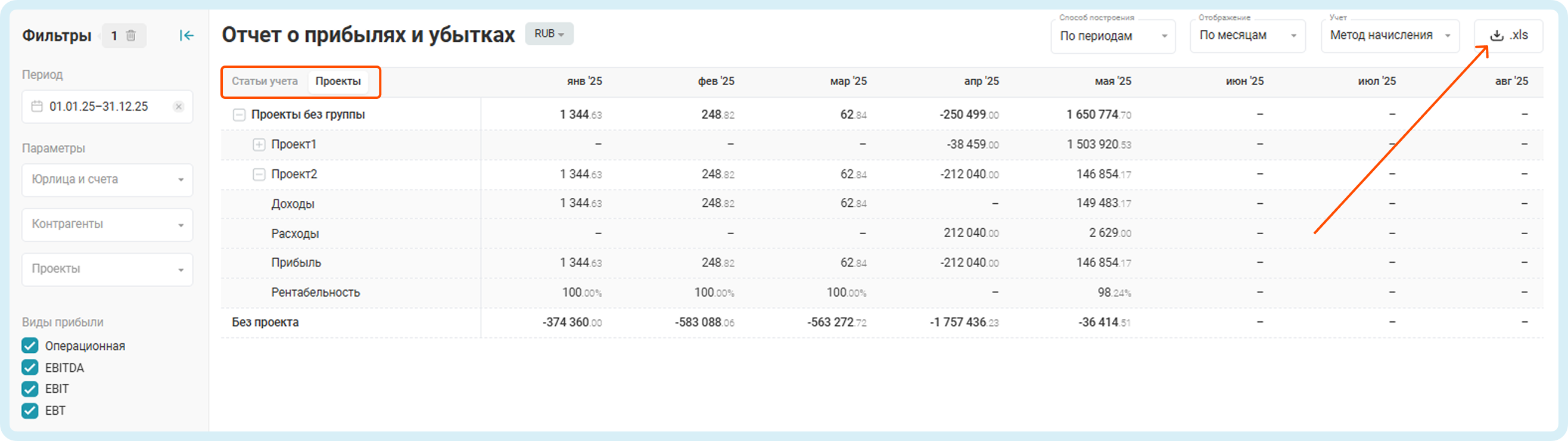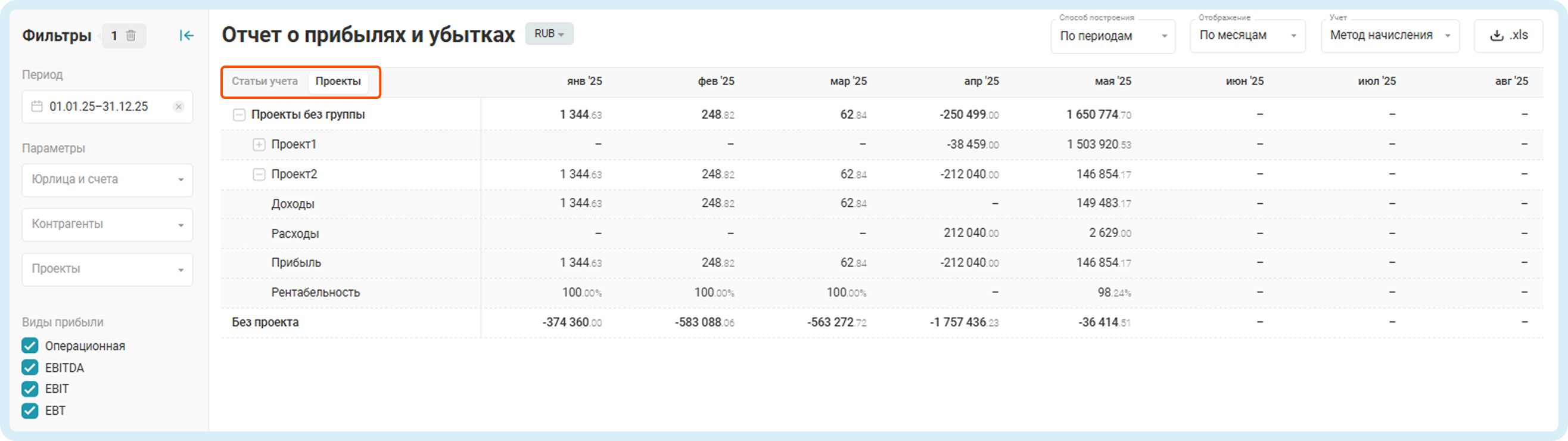 Если в сервисе вы ведете проекты, то при построении отчета данным способом, можно увидеть аналитику в разрезе проектов по указанным в фильтре параметрам. Такое построение покажет разницу между Доходами и Расходами по каждому из проектов.