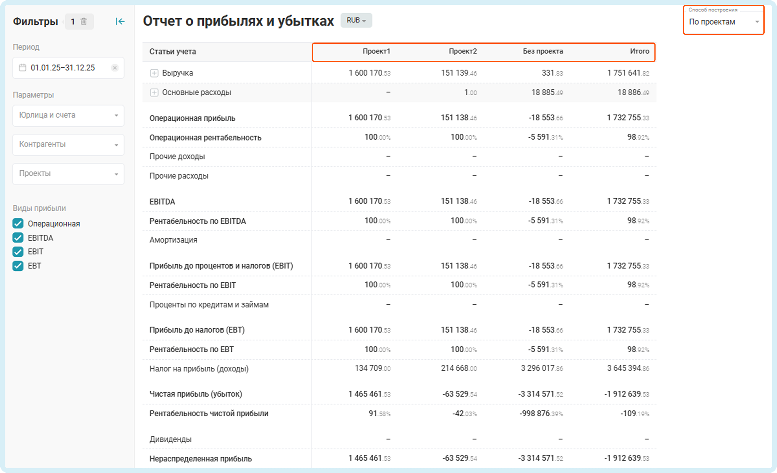 2. По проектам. Данный способ построения позволит увидеть аналитику в разрезе проектов с разбивкой по статьям учета. Дополнительно можно указать в фильтре необходимые параметры.