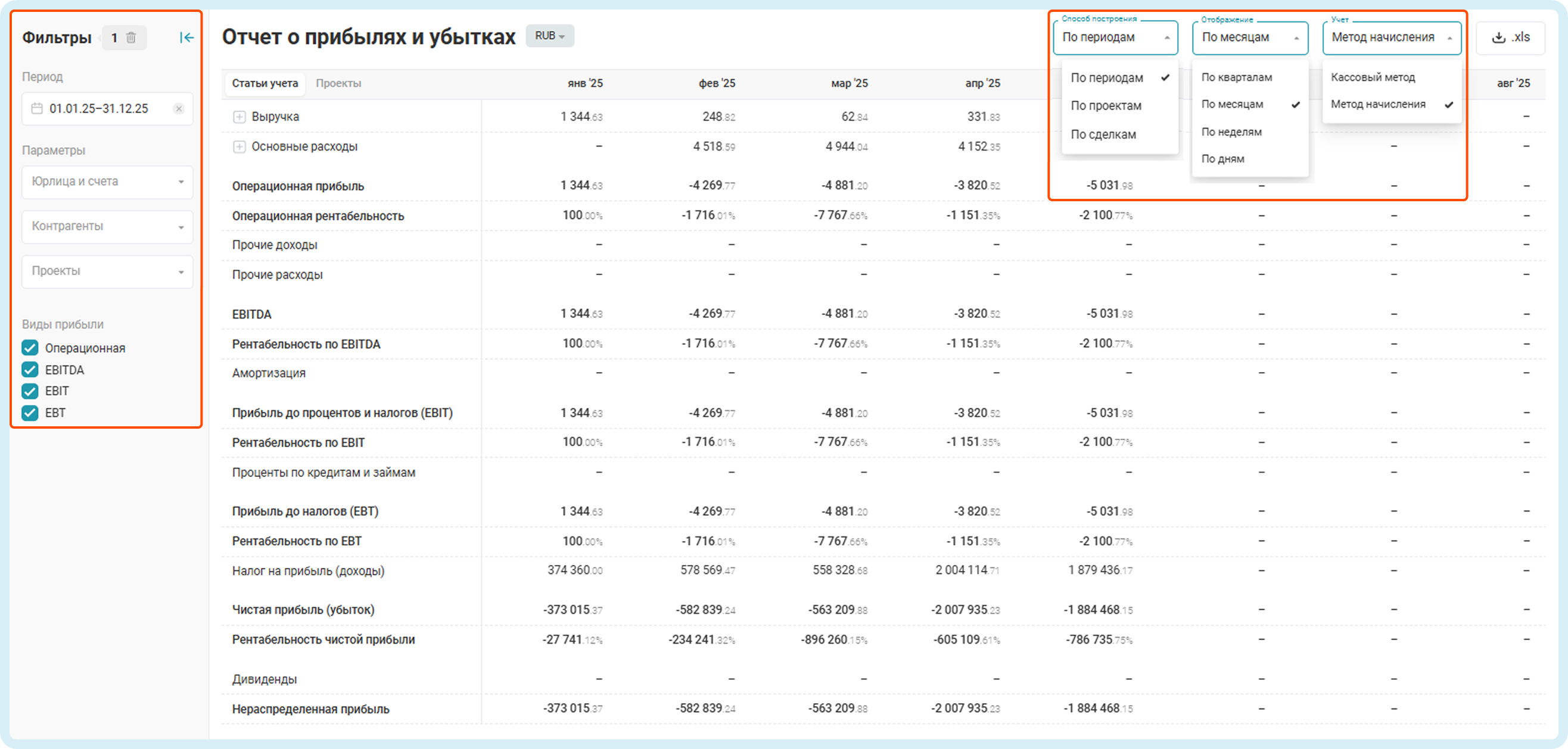 1. По периодам. При построении по периодам вы можете выставить фильтр слева (указать диапазон построения, счет/юрлицо, контрагента и проект/группу проектов, сделку) и выбрать отображение По годам, По кварталам, По месяцам, По неделям и По дням. Отображение зависит от выбранного в фильтре слева периода построения отчета.