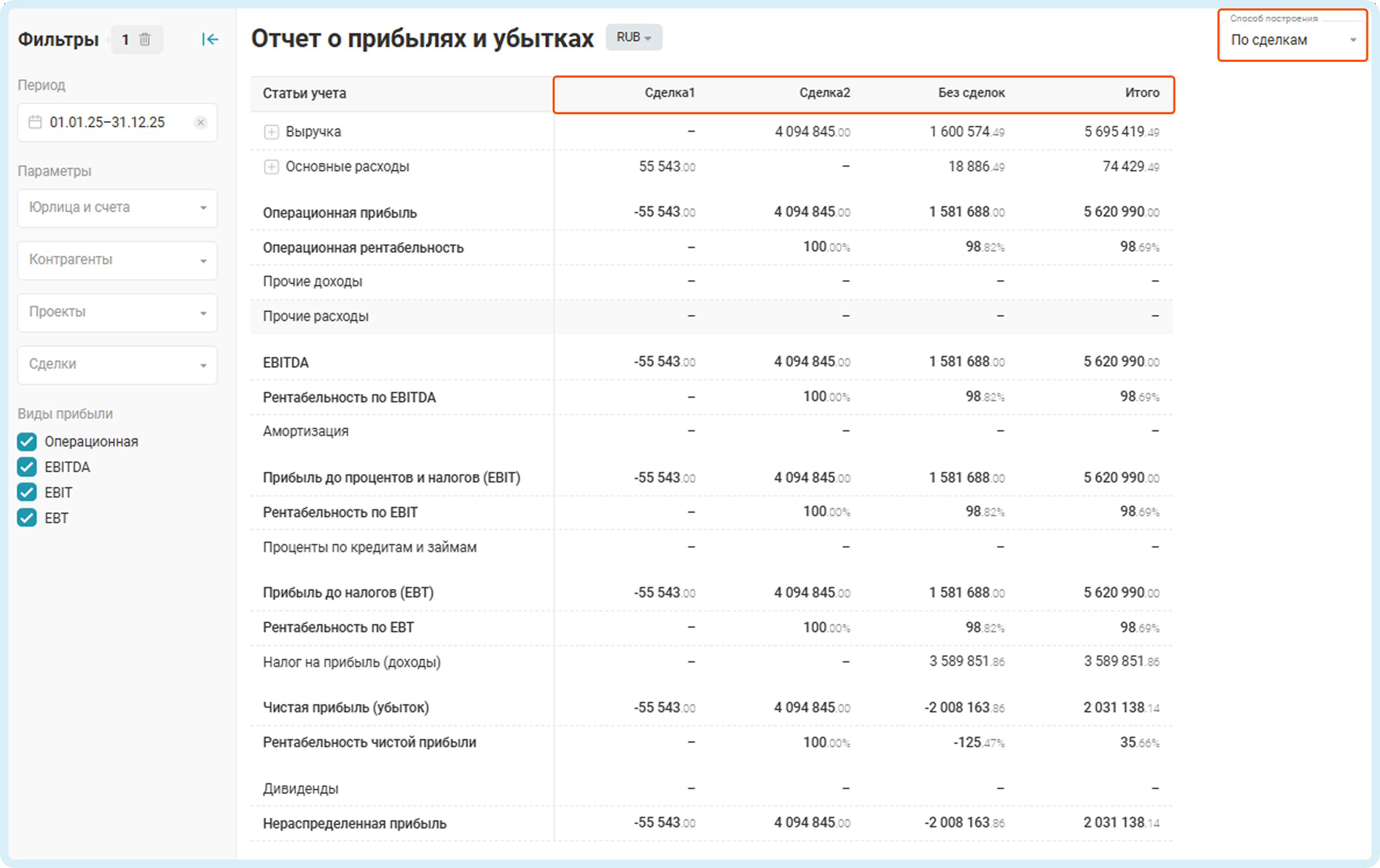 3. По сделкам. Данный способ построения позволит увидеть аналитику в разрезе каждой сделки с разбивкой по статьям учета. Дополнительно можно указать в фильтре необходимые параметры. Сформировав отчет, можно оценить рентабельность и финансовые показатели каждой сделки.