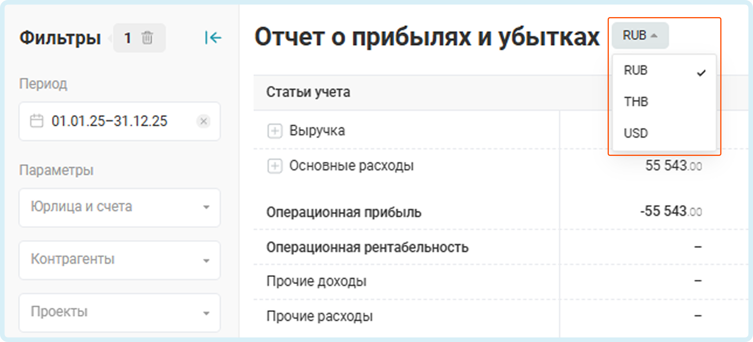 2. Если в аккаунте ведется учет счетов в разной валюте, то отчет по умолчанию строится в валюте аккаунта. Валюту построения ОПУ можно изменить в самом отчете. При этом валютные счета будут конвертированы по курсу ЦБ РФ на дату операции или по методу начисления (конвертация зависит от выбранного в отчете метода построения - Кассовый или начисления) в валюту построения отчета.