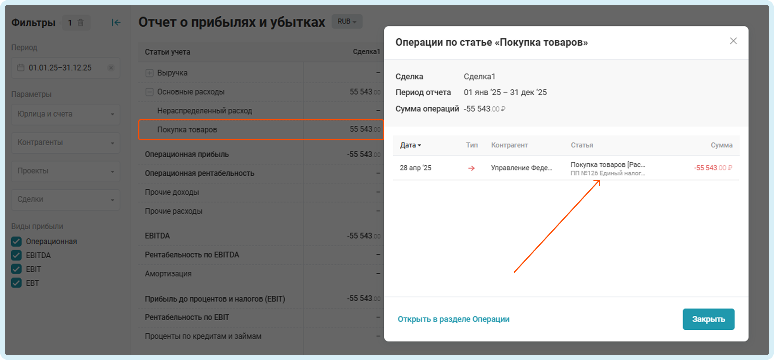3. Суммы в отчете кликабельны. При нажатии на сумму программа откроет окно со списком операций. Чтобы получить полную информацию по операциям, увидеть фильтры, экспортировать отобранные операции и провести другие действия, нажмите в нижней части открывшегося окна на Открыть в разделе операции. На соседней вкладке появится окно Операции с отфильтрованными по сумме данными.