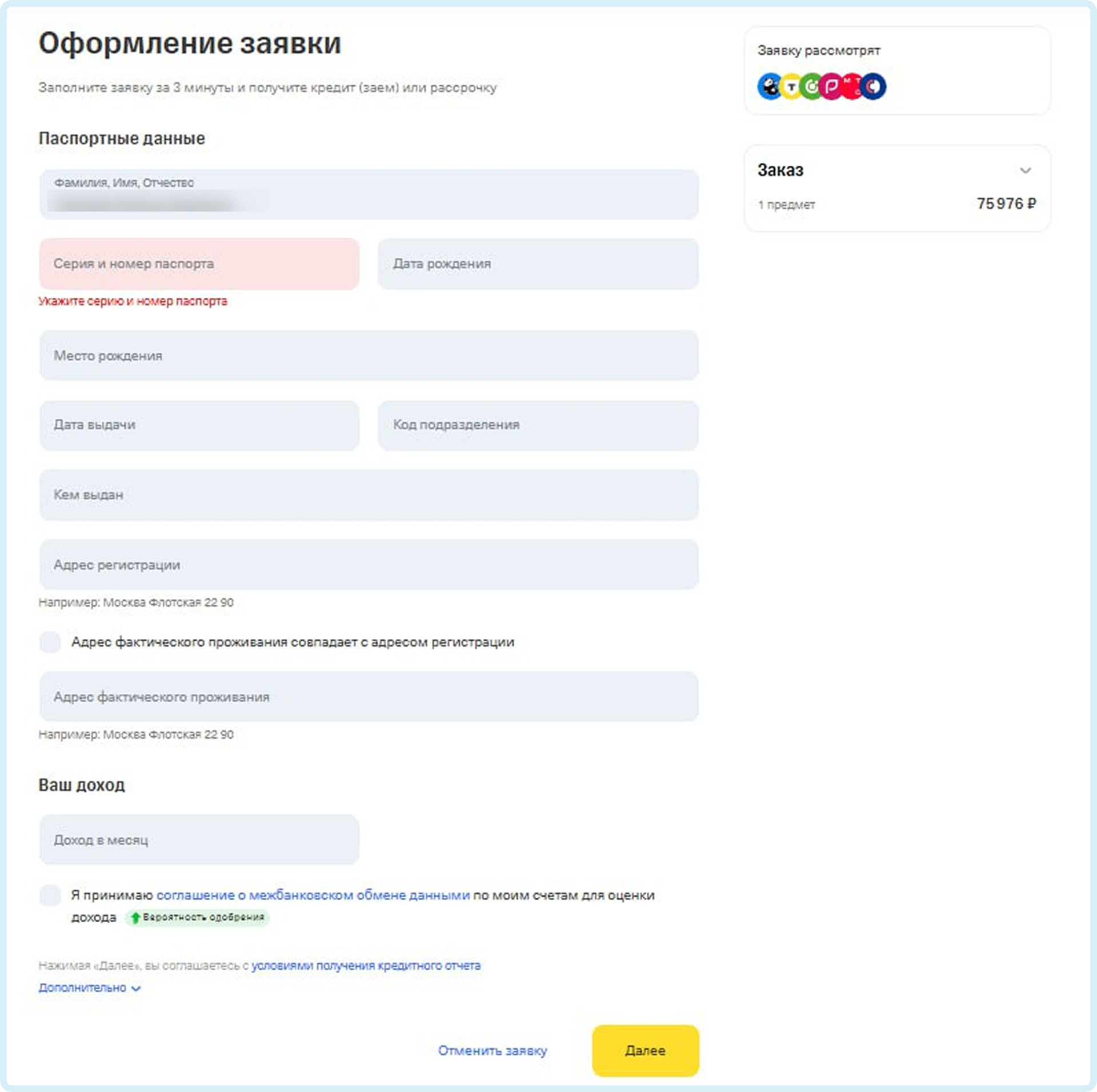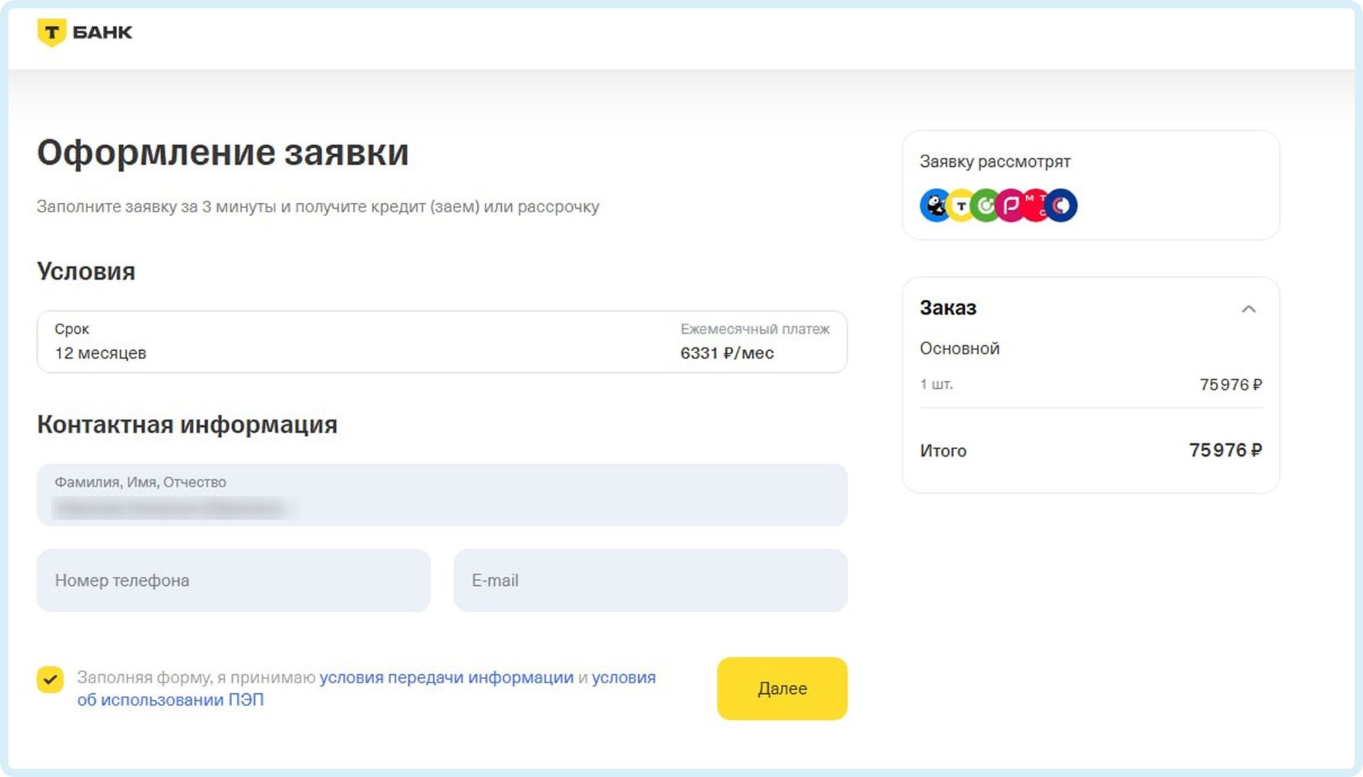 Заполните форму заявки на оформление рассрочки: