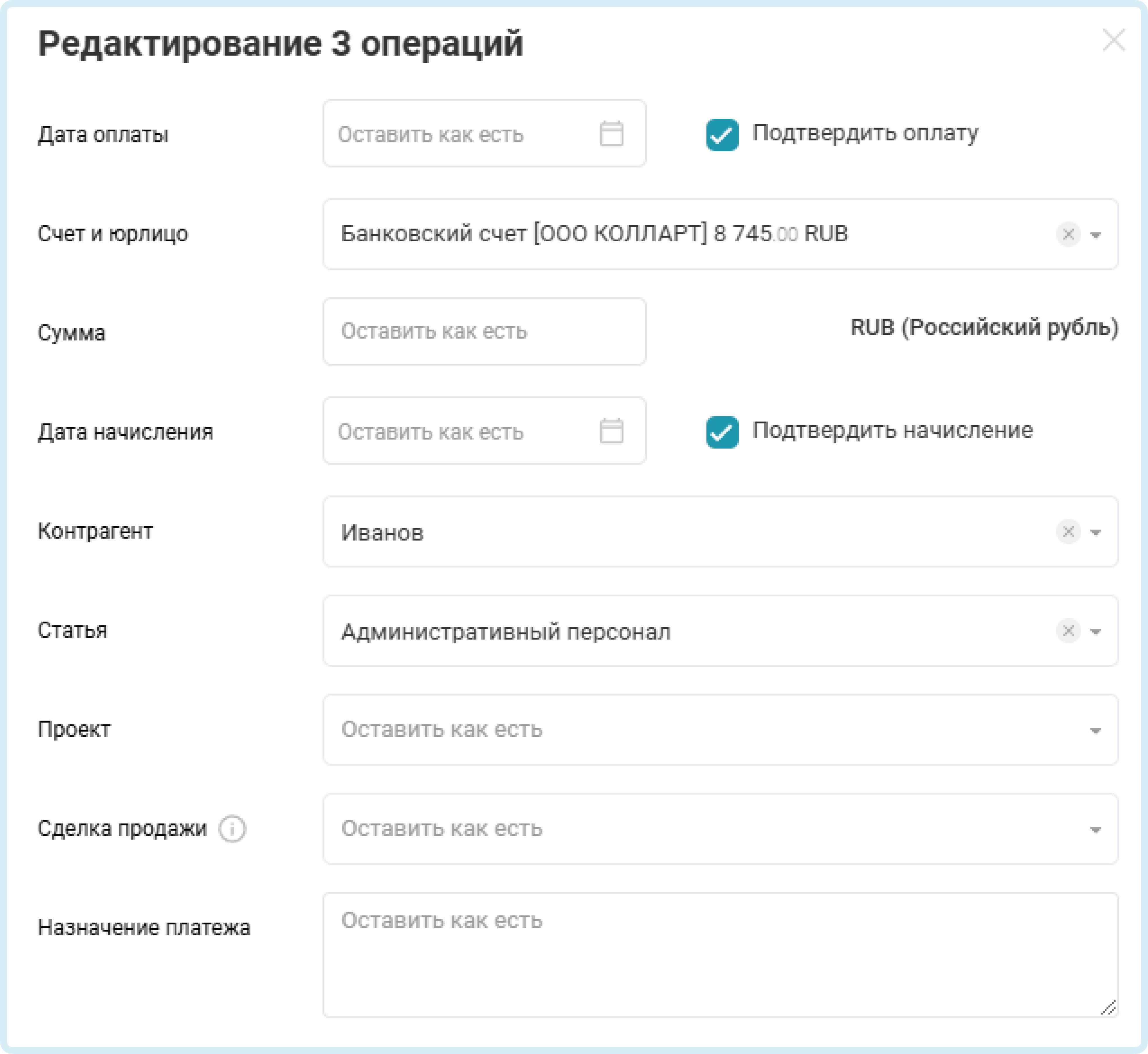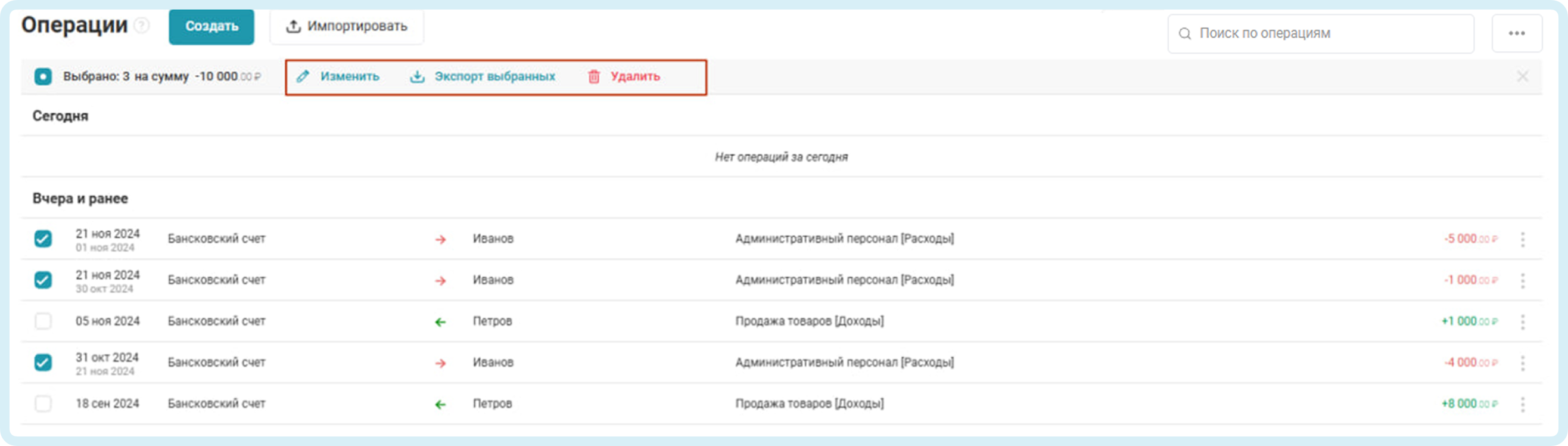 Отметьте в списке операций галочками те платежи, которые требуется изменить