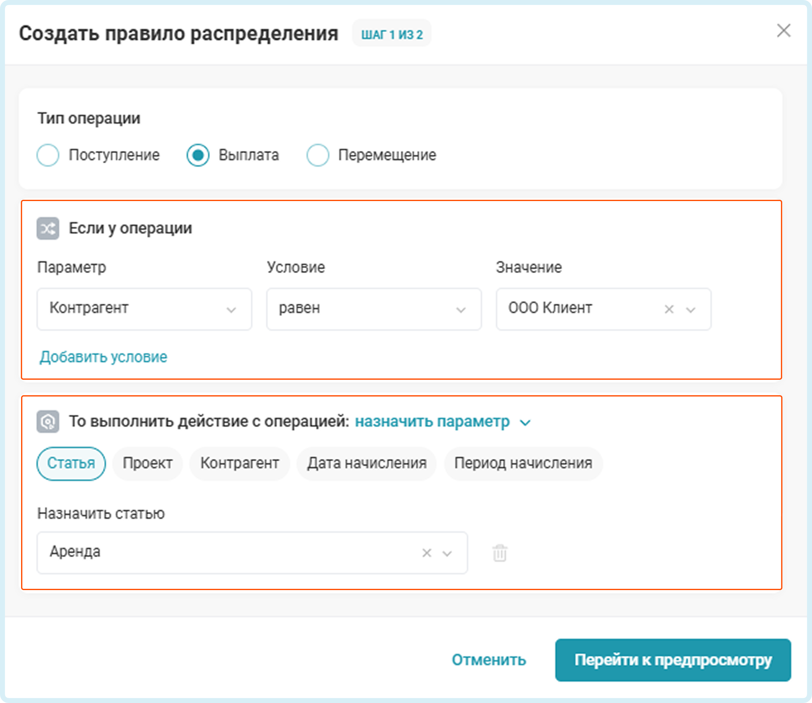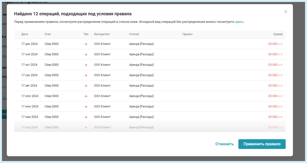 Например, все выплаты по счету Сбер 0000 контрагенту ООО Клиент распределять на статью "Аренда"