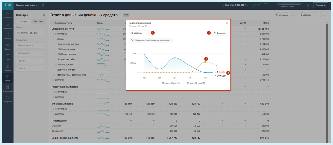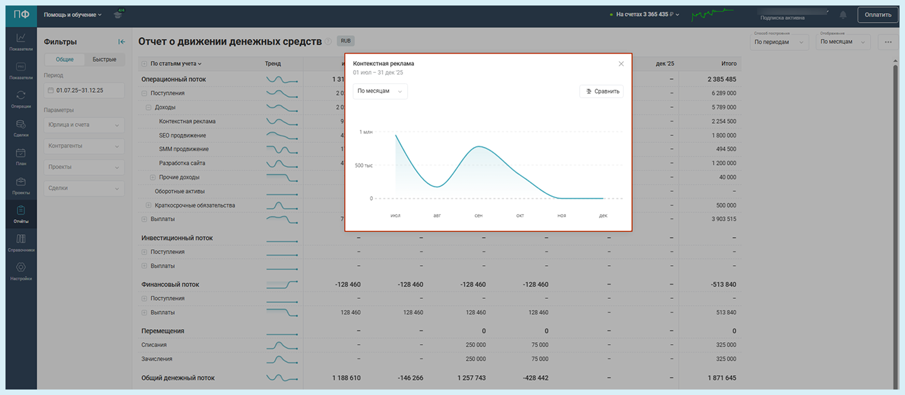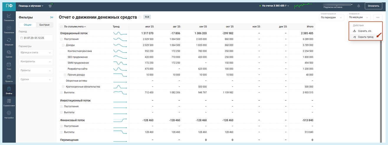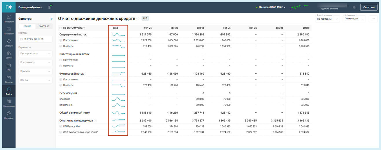 В отчетах «Отчет о движении денежных средств (ДДС)» и «Отчет о прибылях и убытках (ОПУ)» появилась возможность новая колонка «Тренд», в которой выводится небольшой график. Он позволяет сразу видеть динамику показателей прямо в строках отчета — без ручного сравнения периодов и дополнительных выгрузок.