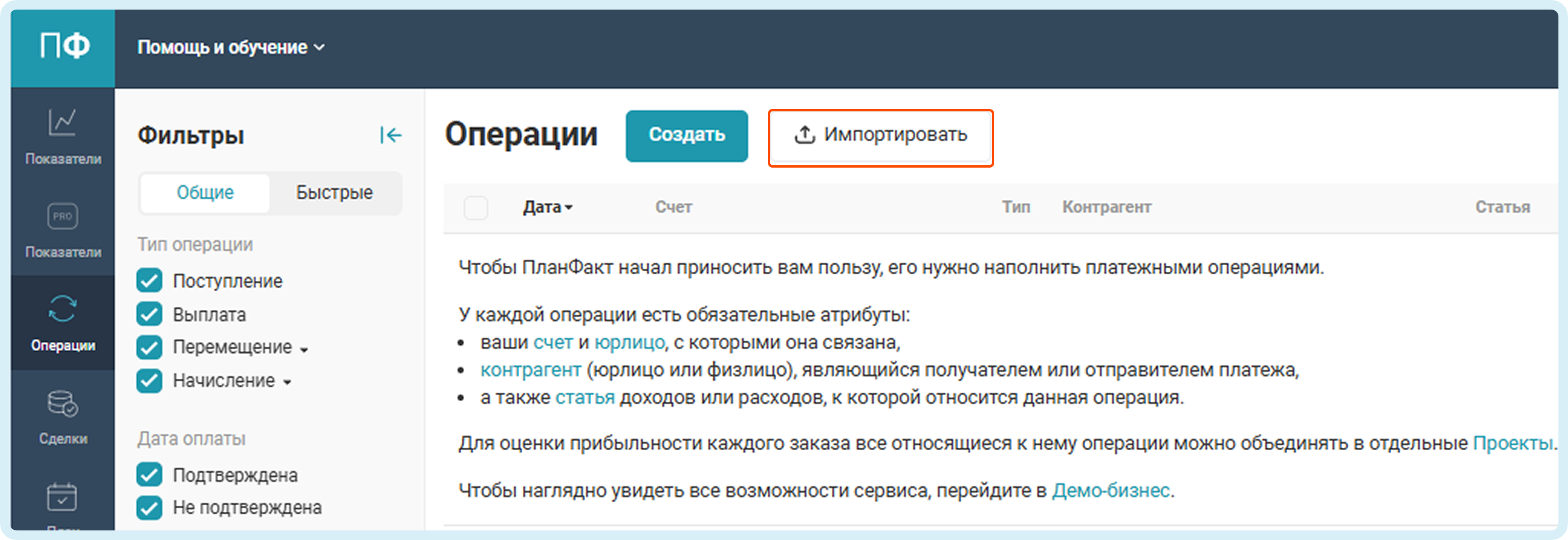 Рассмотрим два раздела, из которых можно импортировать операции в ПланФакт.