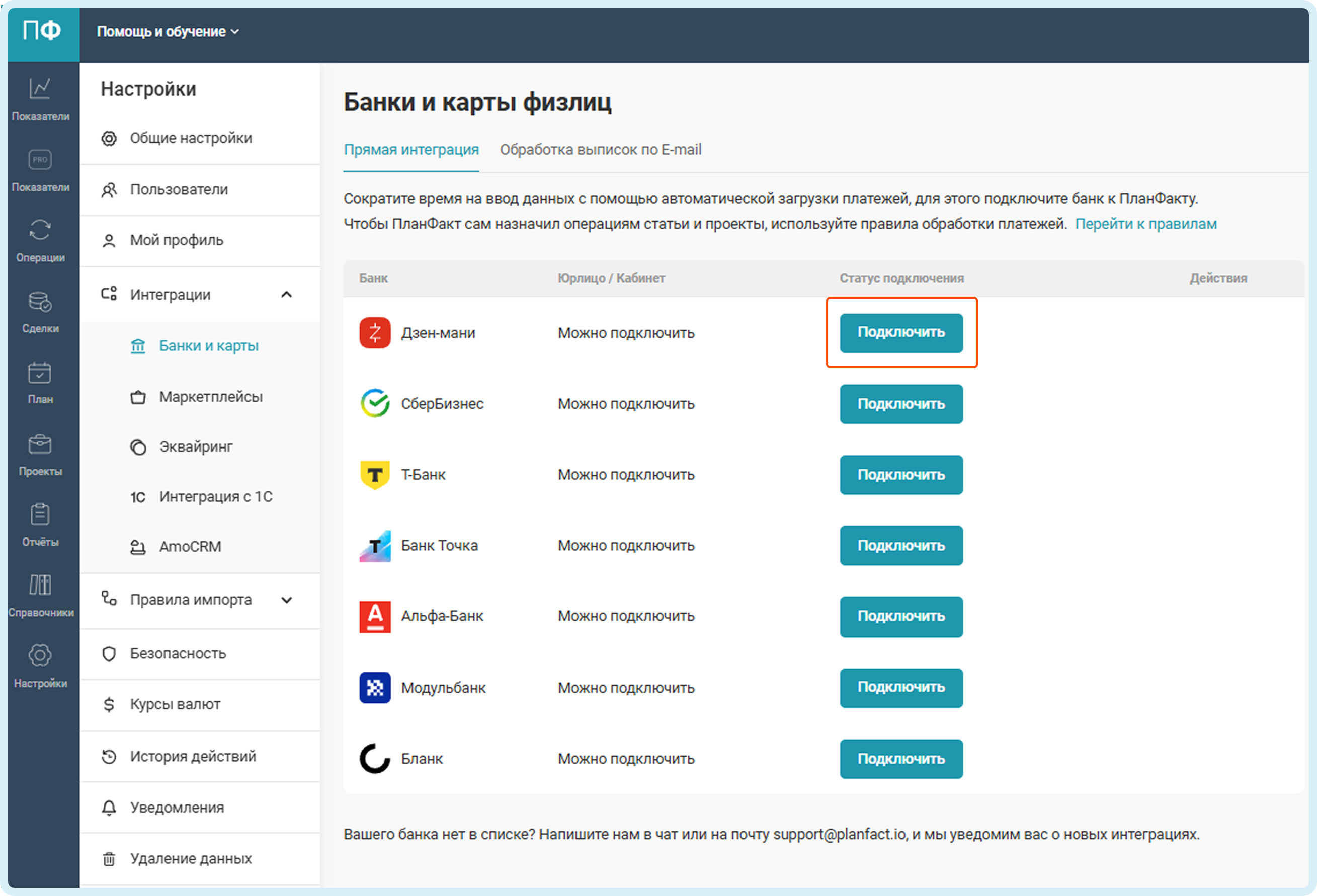 В ПланФакте перейдите в раздел Настройки - Интеграции - Банки и карты и нажмите на кнопку Подключить. Выберите Дзен-мани.