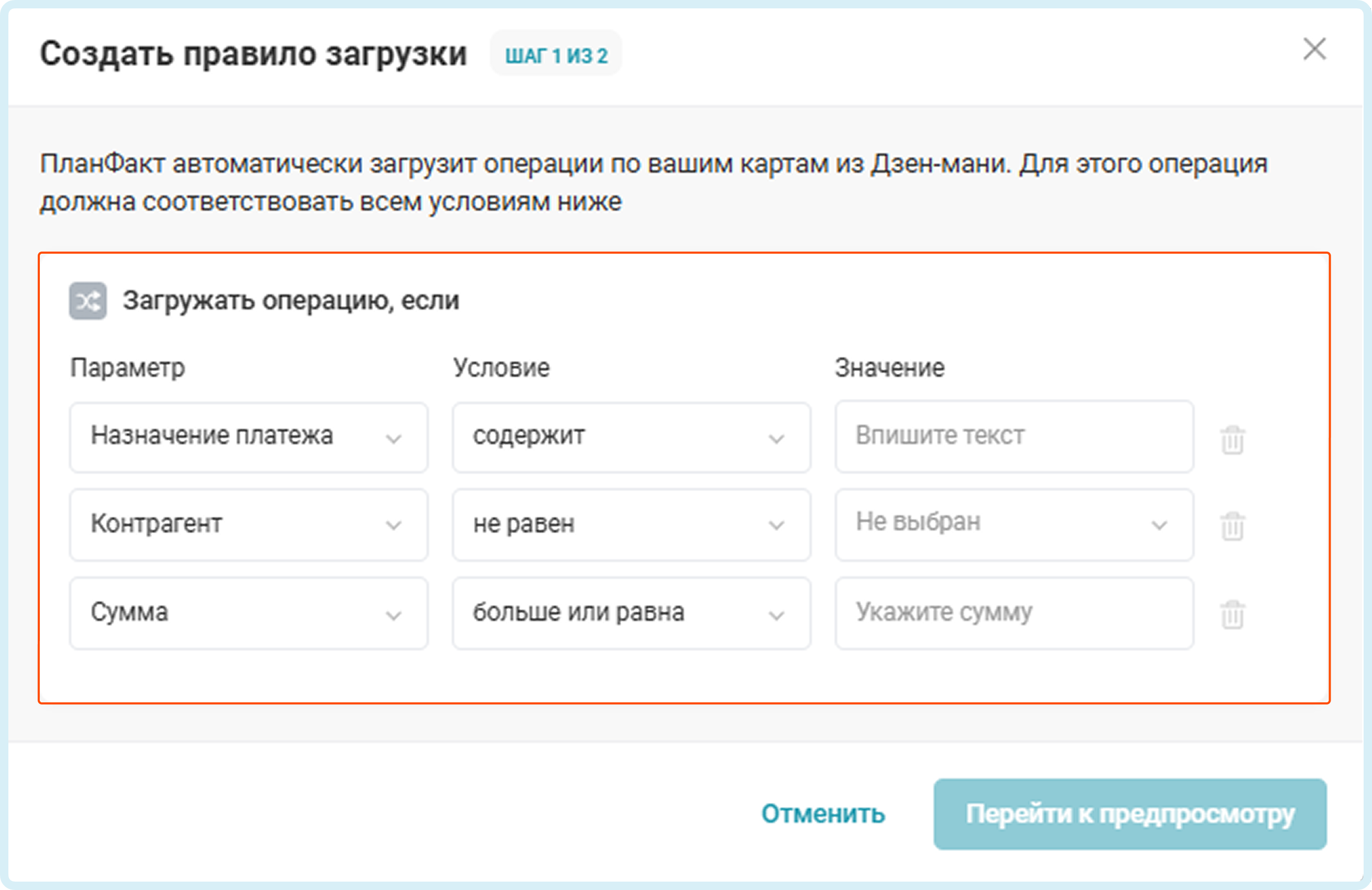 Управляйте тем, какие платежи будут загружаться в ПланФакт → задайте условия, при которых операции из Дзен-мани поступят в сервис.