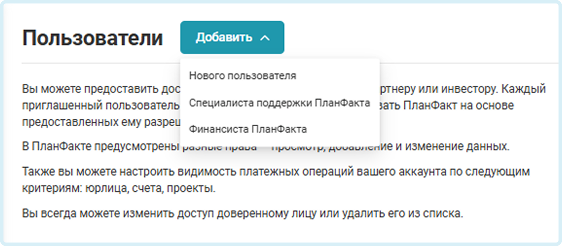 В аккаунт можно добавить ваших сотрудников, а также специалистов службы поддержки и консультантов ПланФакта.