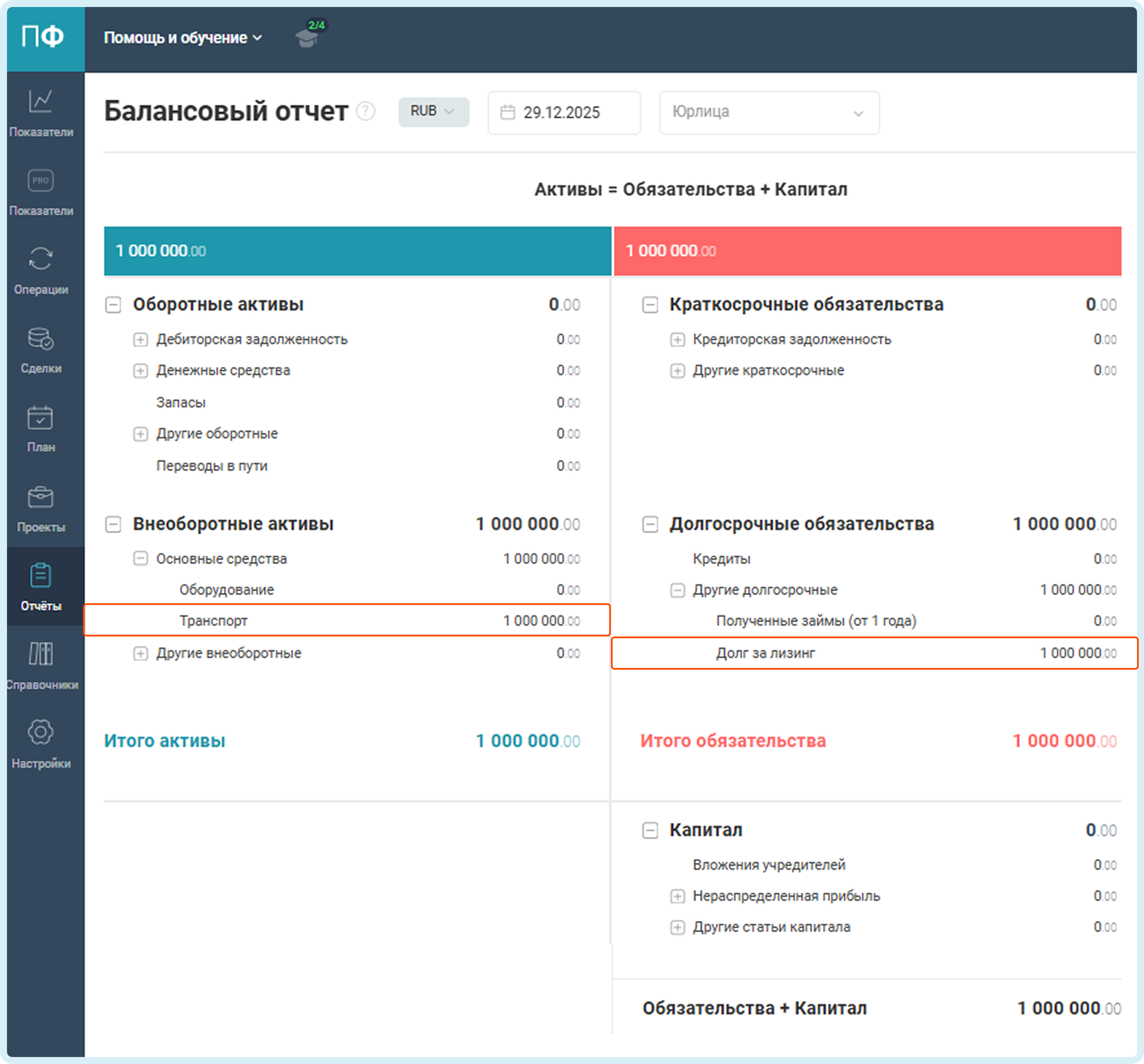 После добавления операции в отчете Баланс появился долг в разделе Долгосрочные обязательства, при этом Денежные средства также увеличились на 1 млн руб. Таким образом, остаток по счету увеличился на сумму полученного лизинга.