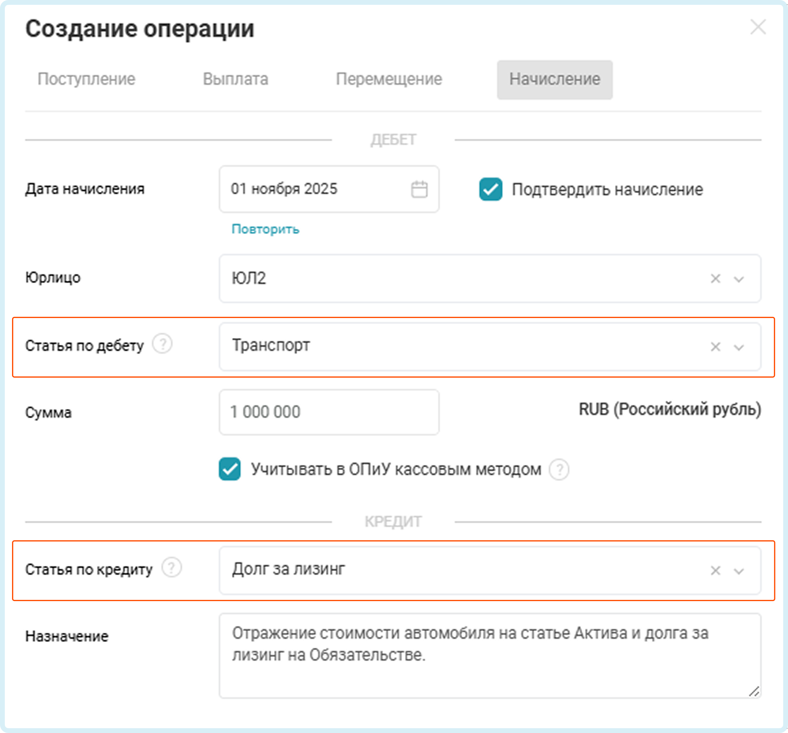 Вместо двух зеркальных операций Поступления и Выплата создайте операцию Начисление: статья по дебету Транспорт (Активы), статья по кредиту Долг за лизинг (Обязательство).