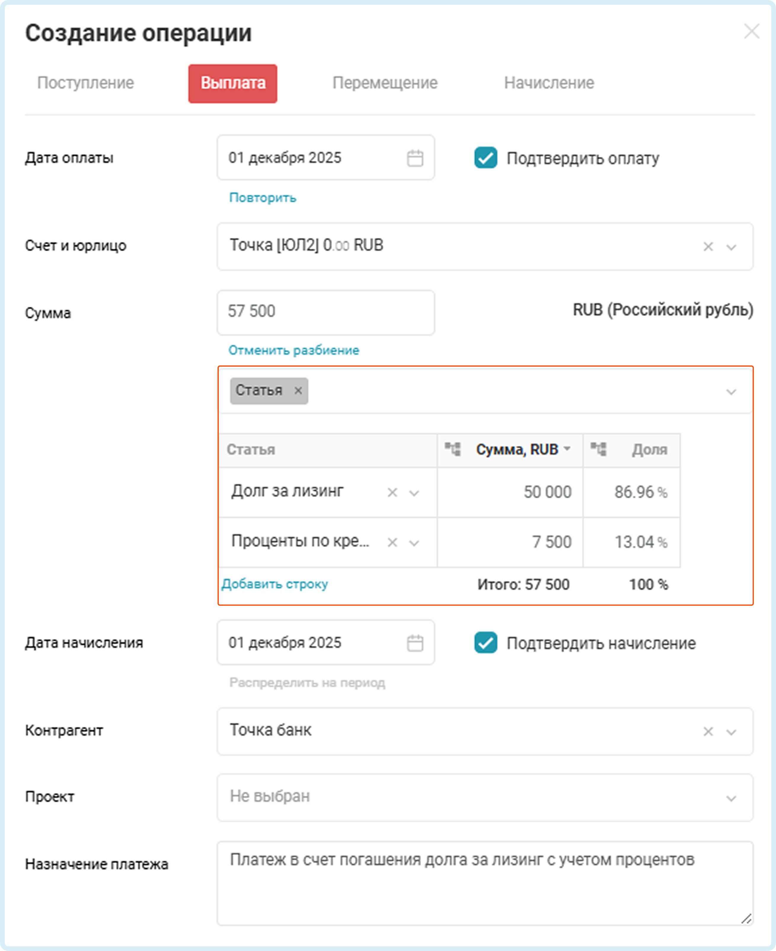 счет — укажите расчетный счет вашей компании, который был указан в операции Поступления по статье Долг за лизинг