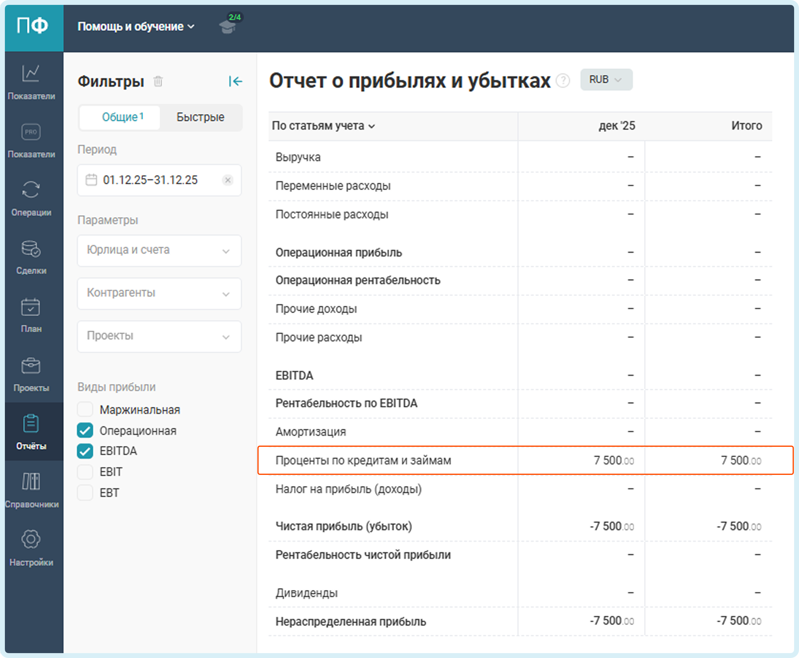 После создания такой операции сумма долга в Балансе уменьшится, а также в Отчете о прибылях и убытках отразится расход на выплату процента.