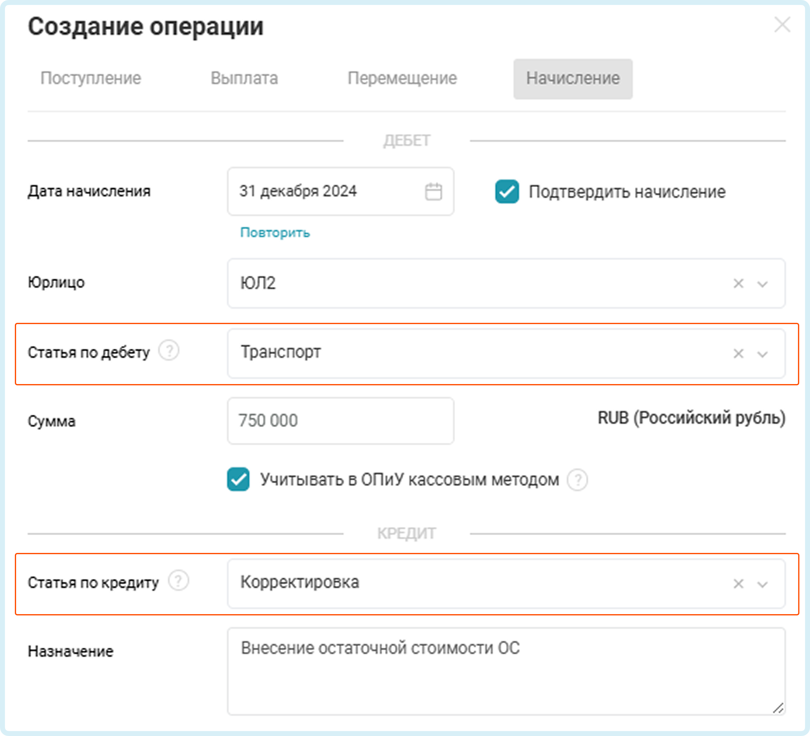 2. Внесем достаток задолженности по лизингу: создайте операцию типа Начисление на сумму остатка по лизингу. В ней укажите статью по дебету Корректировка, статью по кредиту Долг за лизинг.