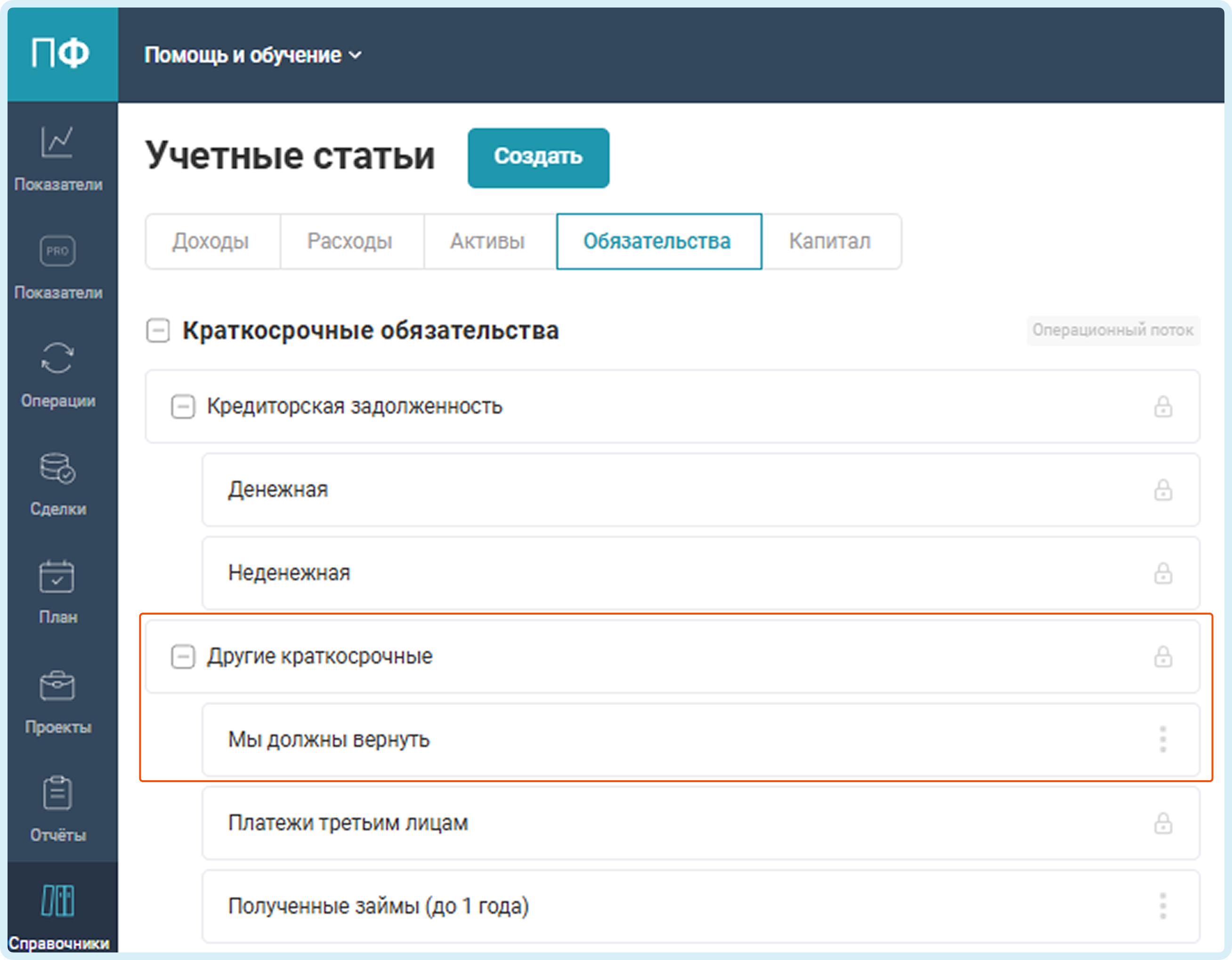 1. В разделе Справочники - Учетные статьи подготовим статью, по которой далее будут проведены операции для оформления возврата в программе. Для этого в разделе Обязательства - Другие краткосрочные создайте статью Мы должны вернуть.
