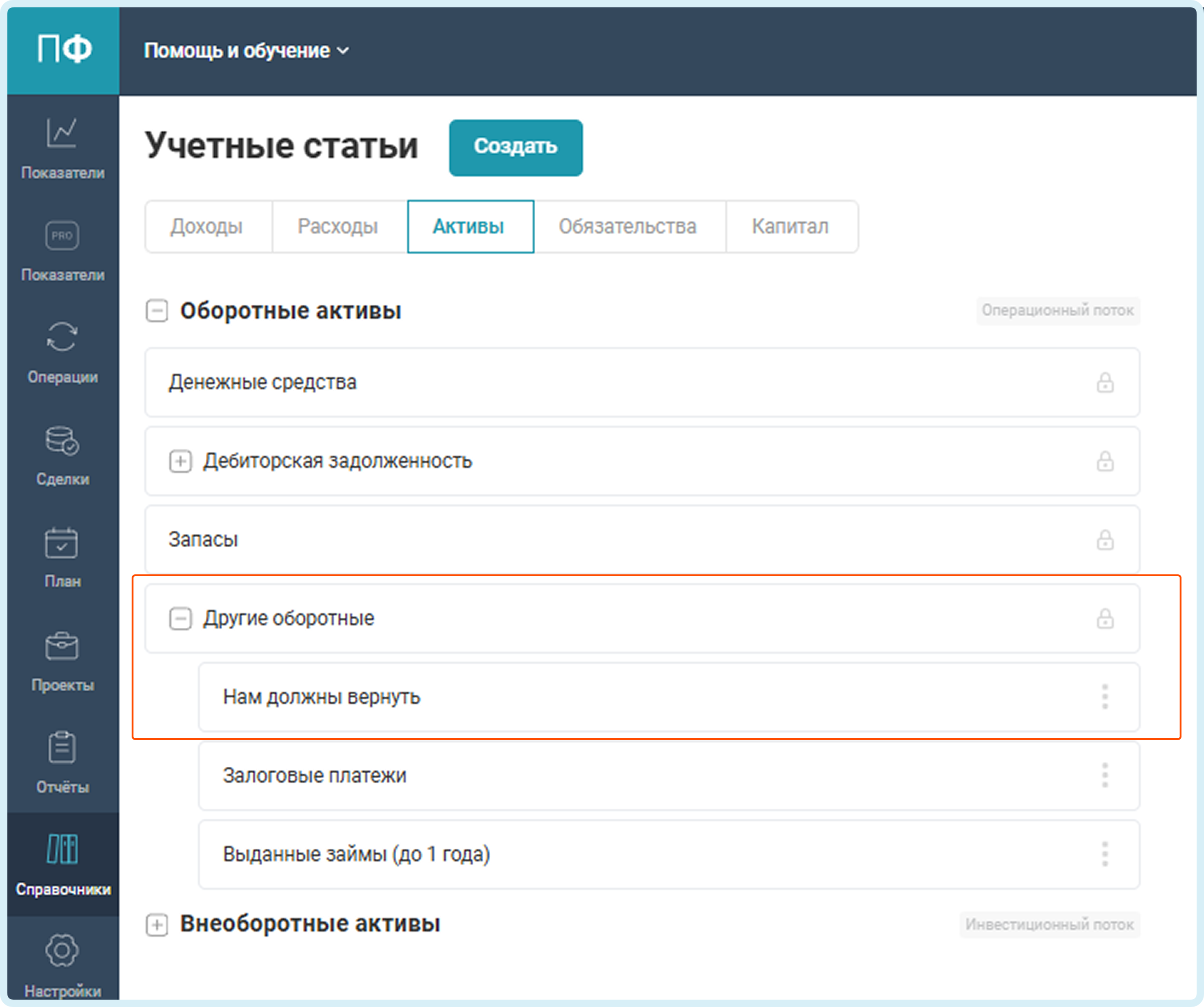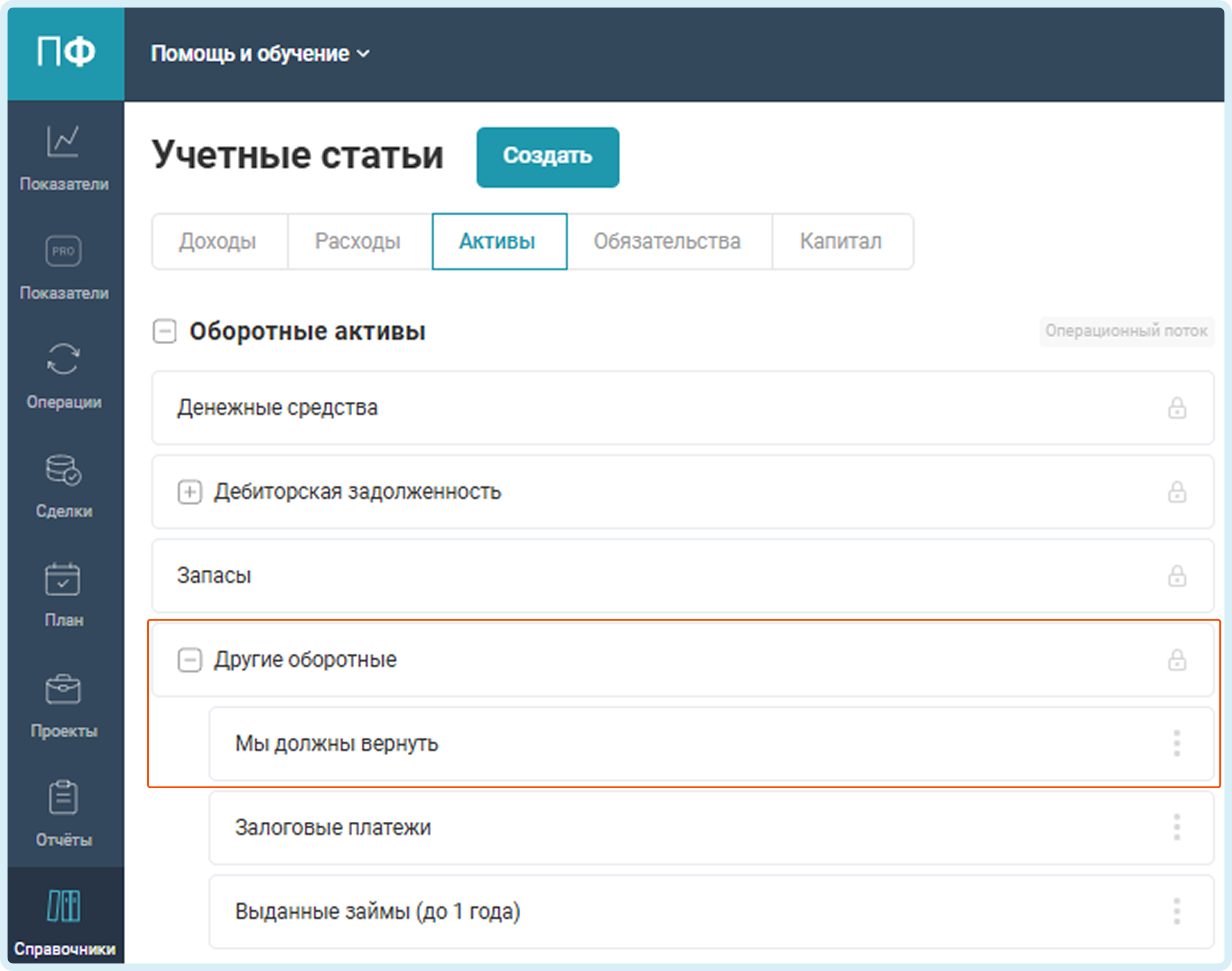 1. В разделе Справочники - Учетные статьи можно подготовить статью, по которой далее будут проведены операции для оформления возврата в программе. Для этого в разделе Активы - Другие оборотные создайте статью Нам должны вернуть.