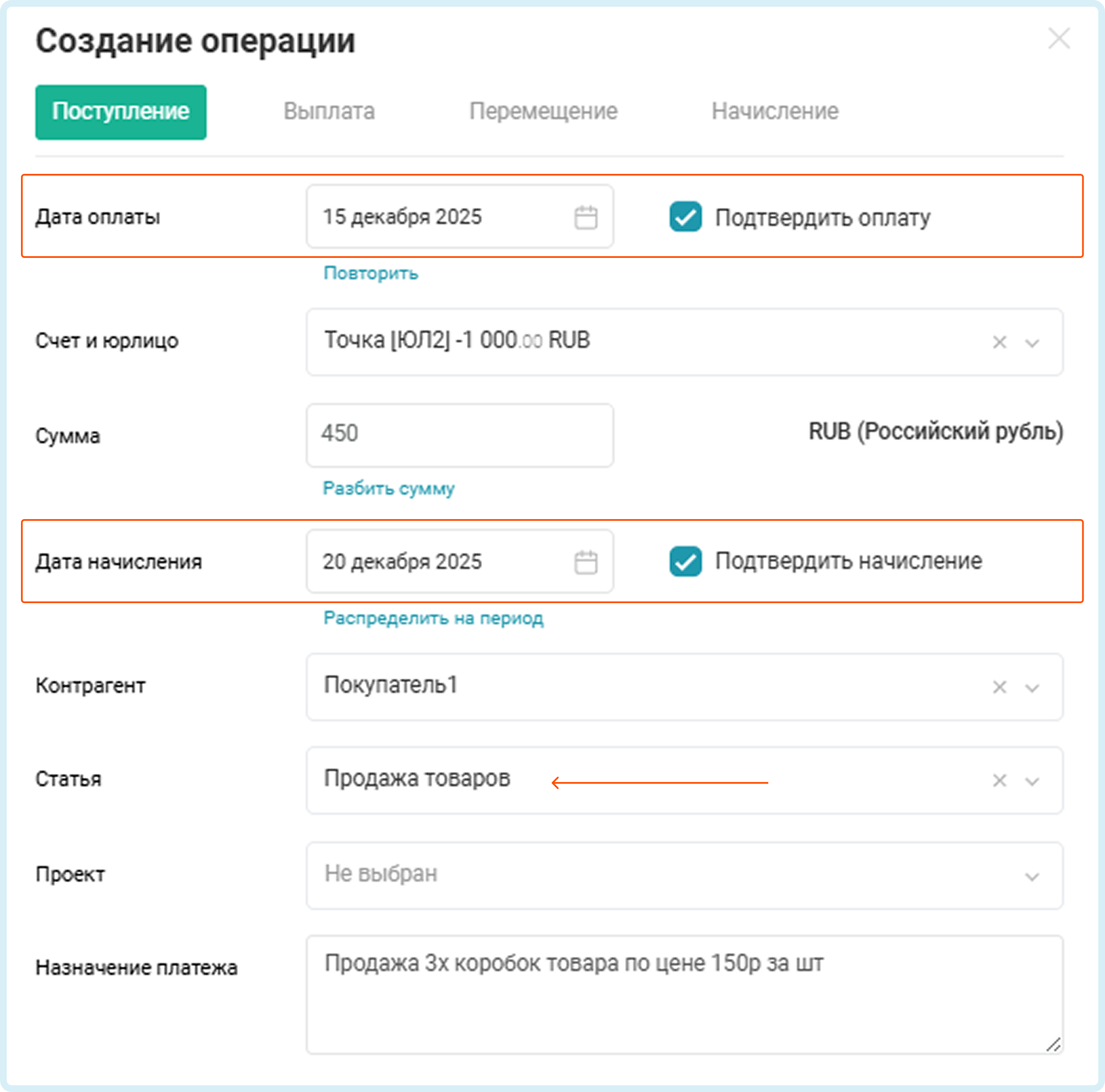 В этой операции Дата оплаты - это дата поступления денег от клиента на ваш счет, а Дата начисления - это дата фактической отгрузки товара клиенту. При оплате за товар от клиента появится доход на сумму 450 руб.