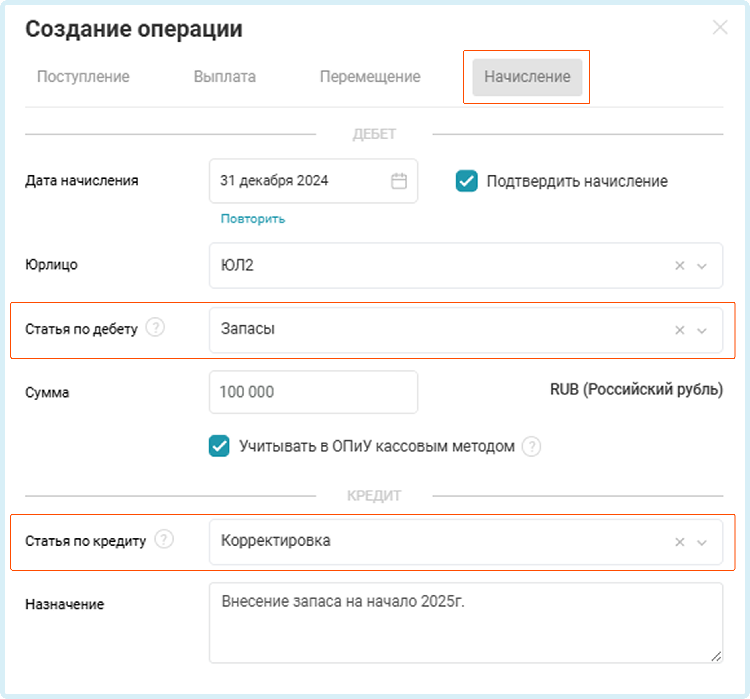 2. Создайте операцию типа Начисление на сумму остатка по запасам. В ней укажите статью списания Запасы, статью зачисления Корректировка.