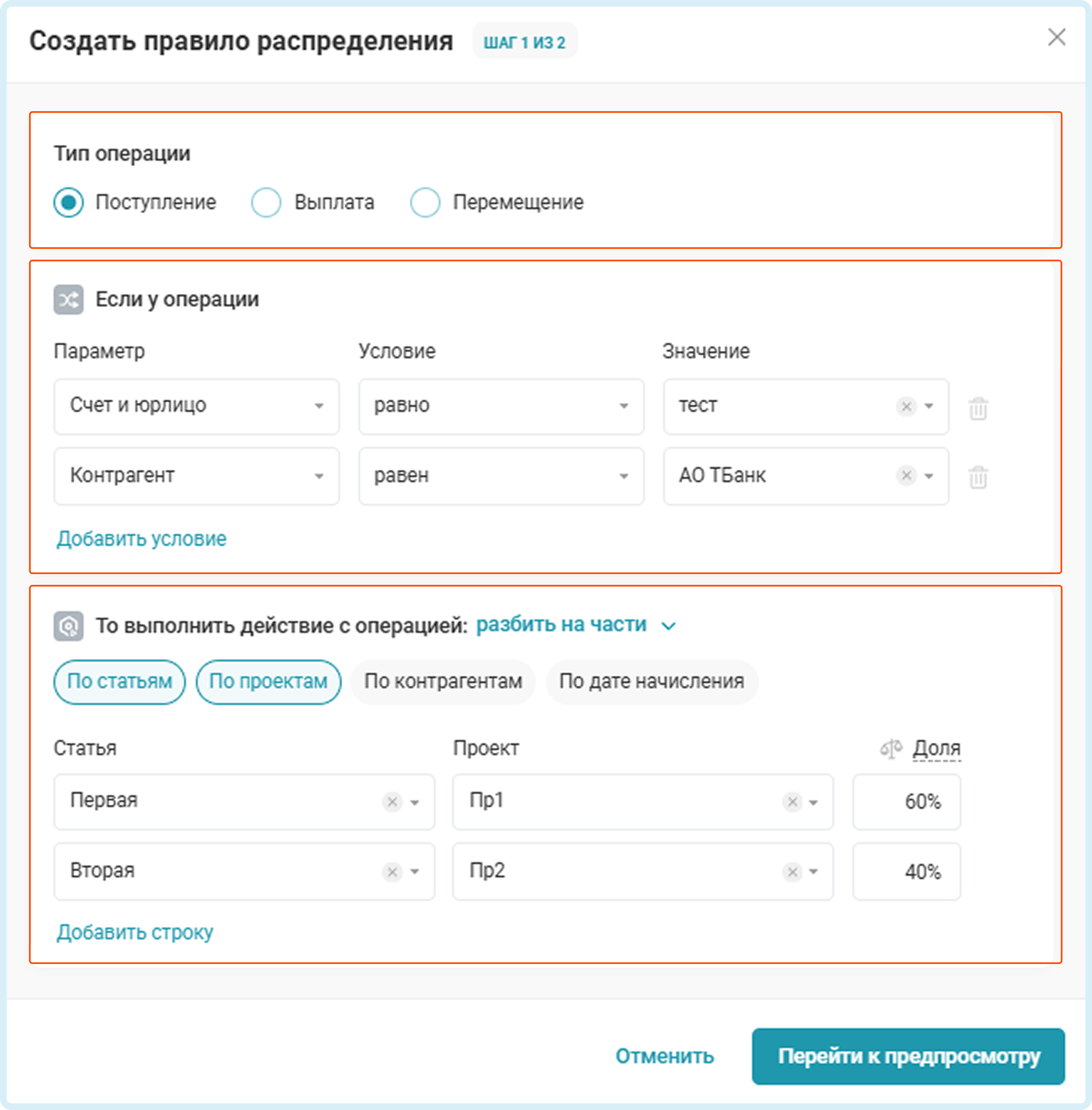 Например, все поступления на счет Тест с контрагентом АО ТБанк разбить по статьям и проектам: статья Первая+проект Пр1 - 60%, статья Вторая и проект Пр2 - 40%.