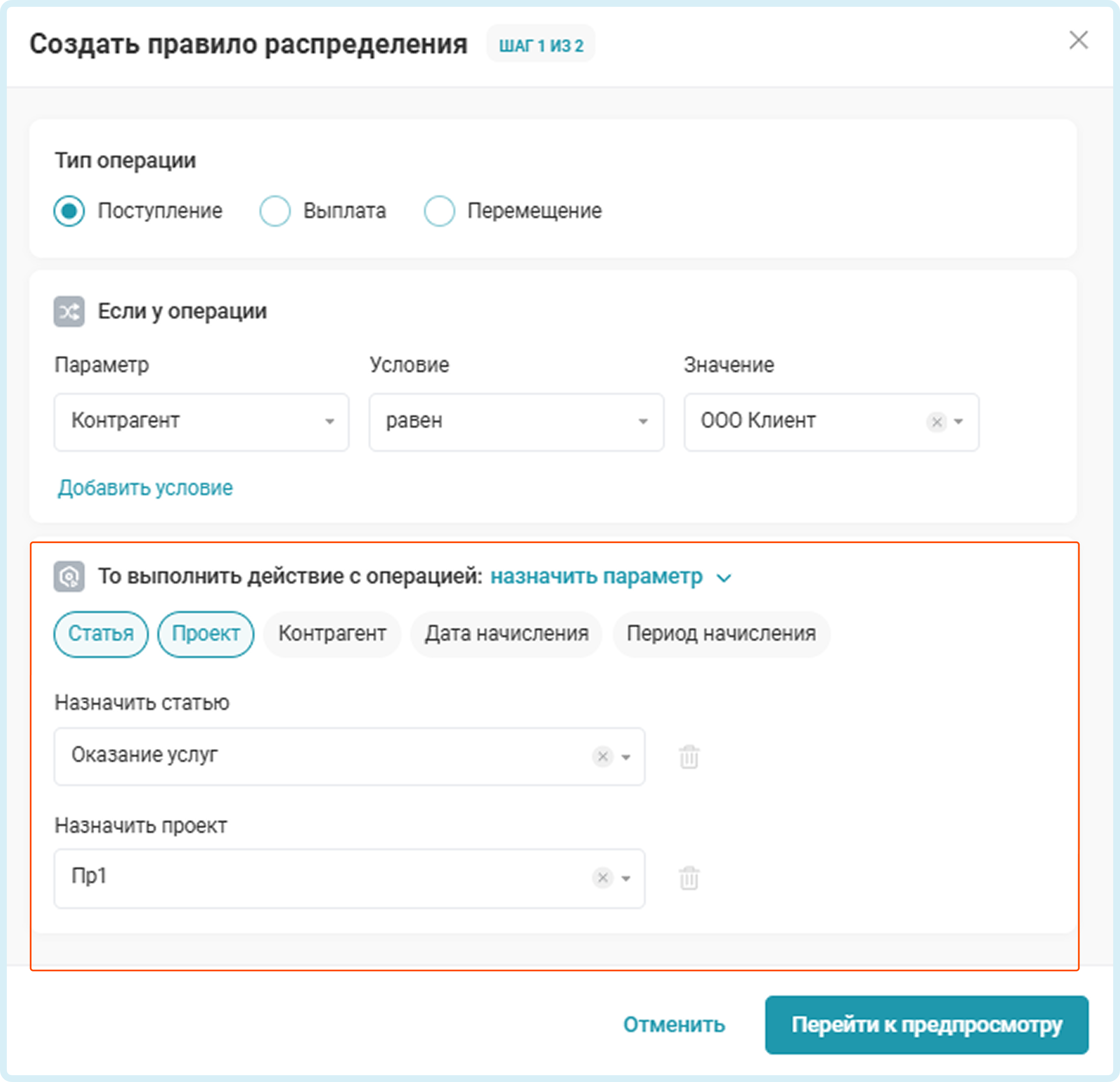 если Контрагент = ООО Клиент, то статья = Оказание услуг