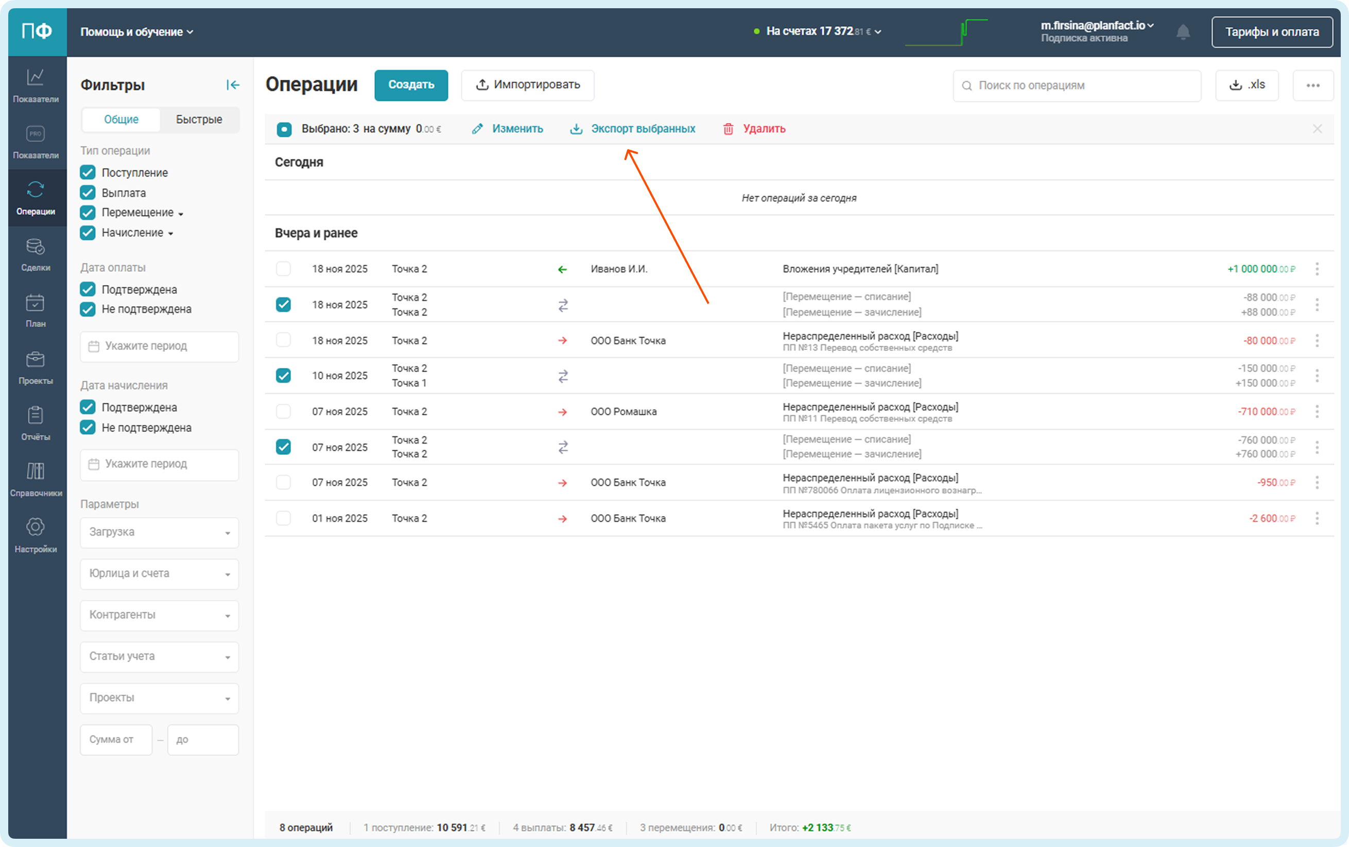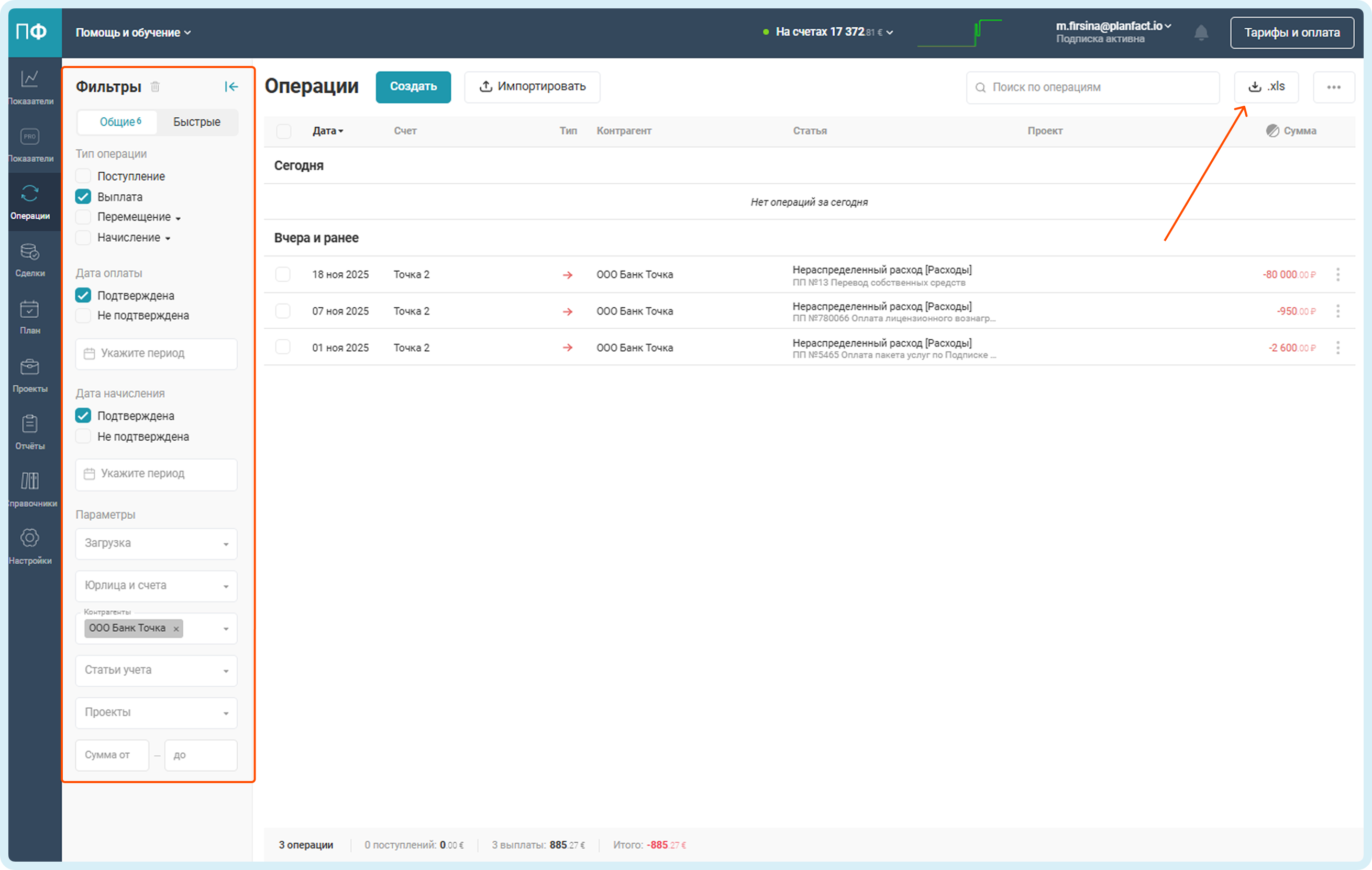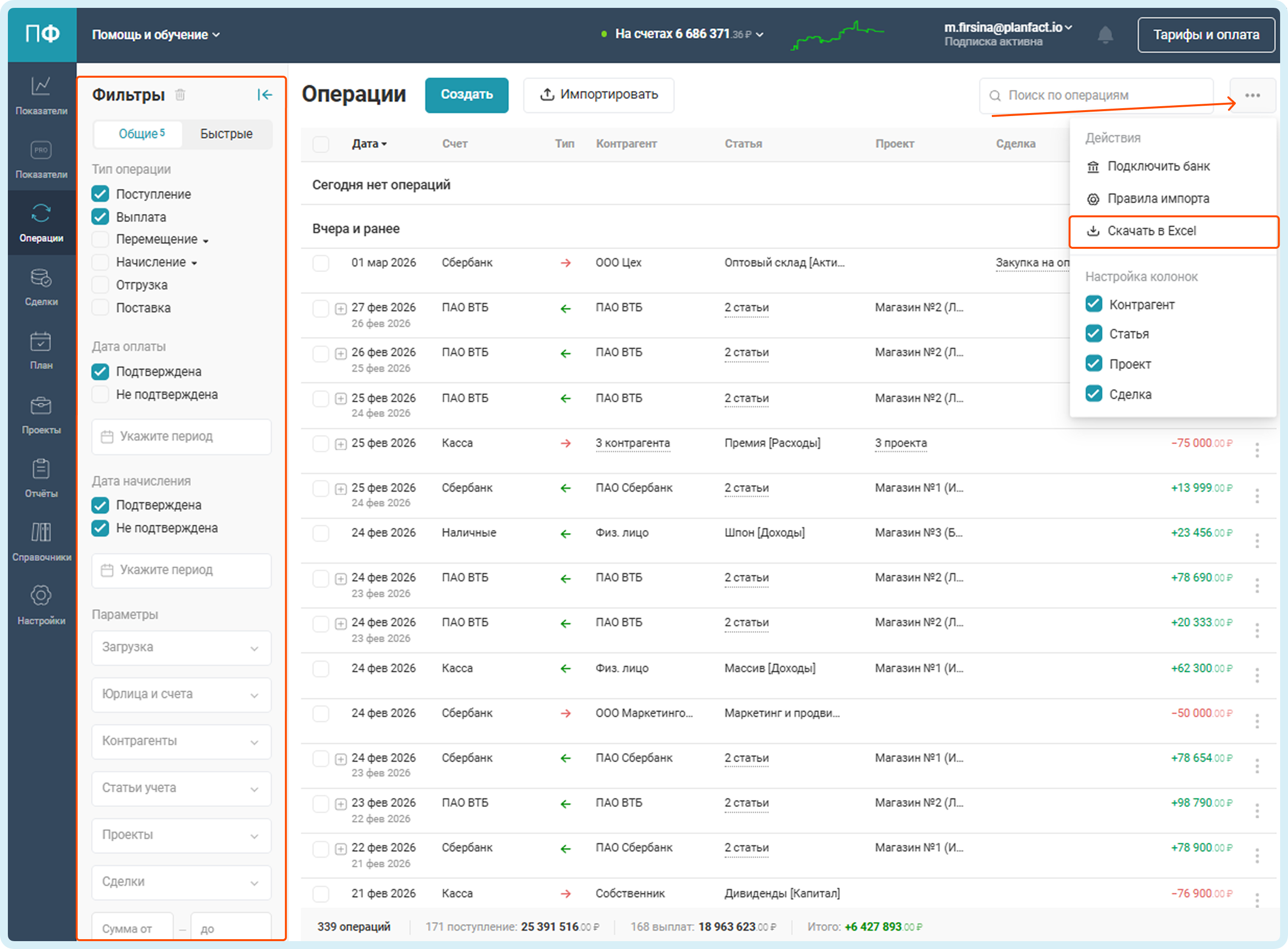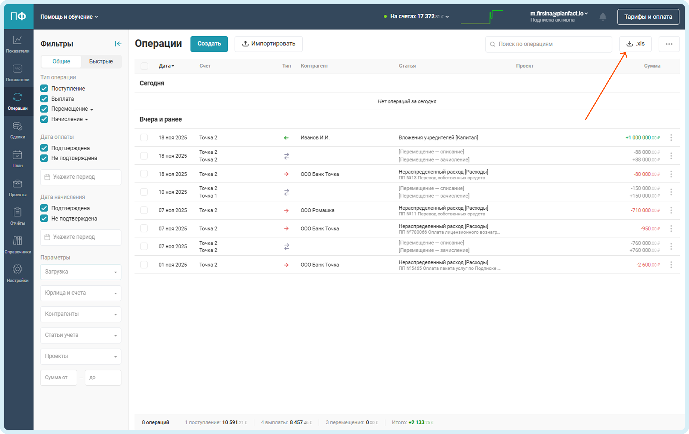 Загрузить в Планфакт платежи из Excel-файла можно из раздела Операции.