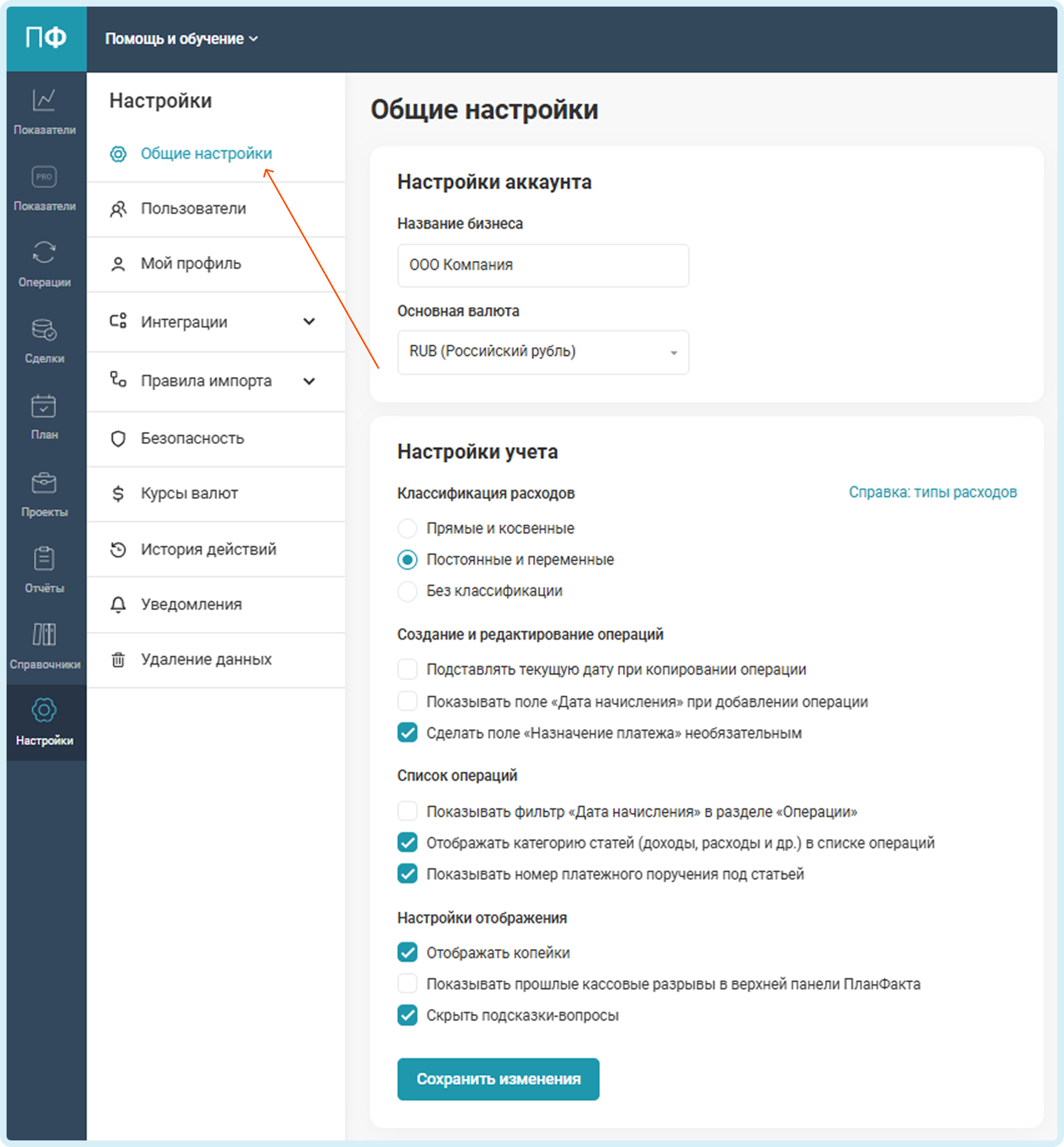 ПланФакт использует оба метода. По умолчанию даты начисления в фильтрах и при создании операции скрыты и равны датам оплаты, чтобы изменить это, в нижнем левом углу выберите Настройки. Поставьте соответствующие галочки и нажмите кнопку Сохранить изменения.