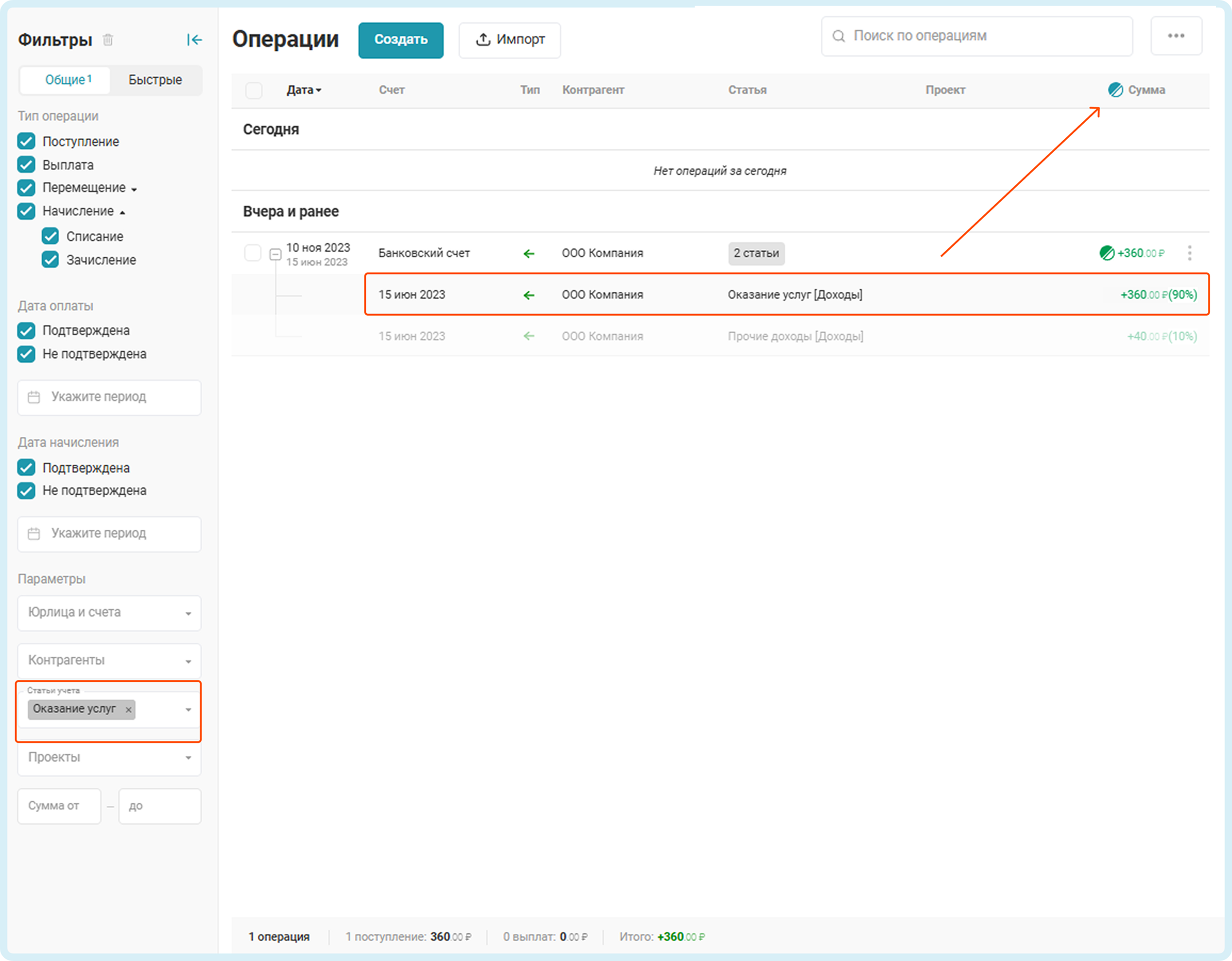Чтобы посмотреть сумму операции с учетом только подходящих к фильтру частей, нажмите на значок доли в заголовке колонки Сумма.