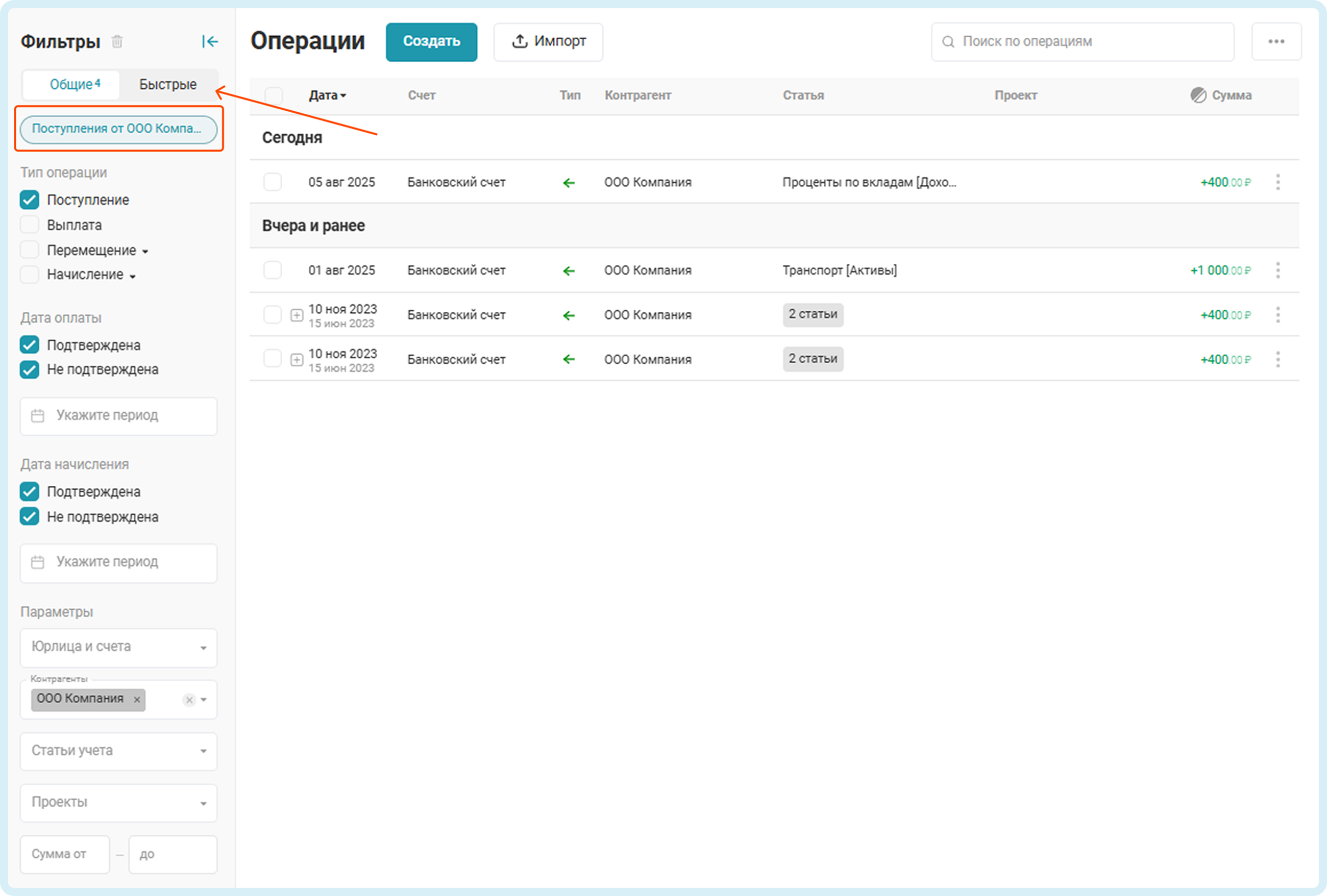 При работе с фильтром помните о том, что если заданным условиям удовлетворяют только части операции, то ПланФакт выведет платеж целиком со всеми его частями: