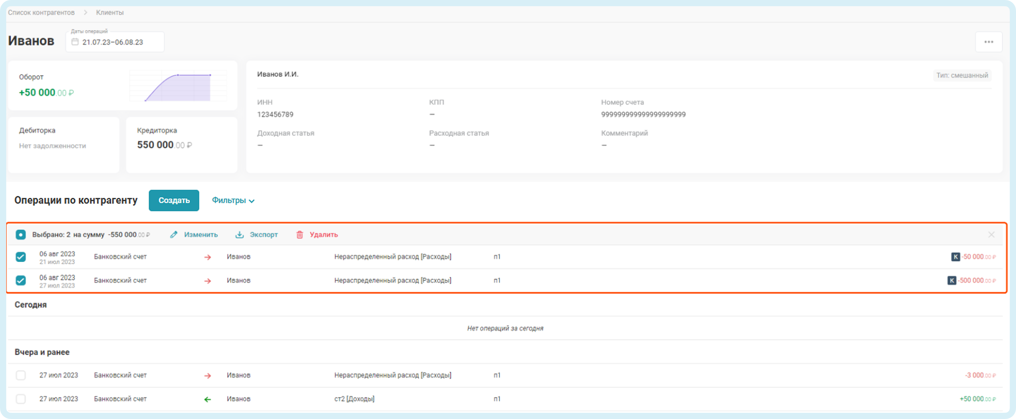 Вы можете объединять контрагентов, перемещать в группу или в справочник Мои юрлица, архивировать, экспортировать список контрагентов и удалять.