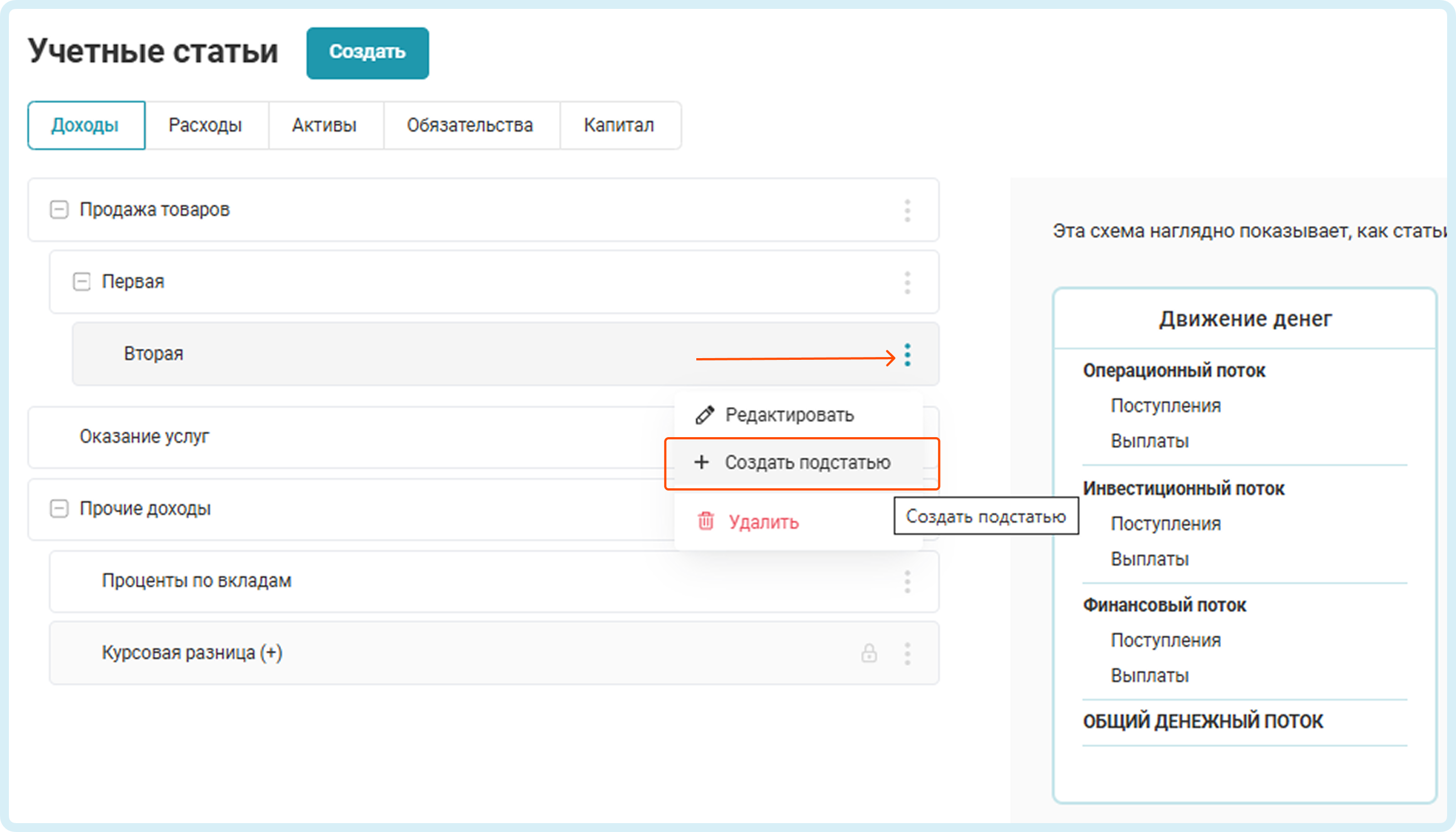 Создать подстатью можно через кнопку Создать или нажмите три точки справа от статьи - Создать подстатью, внутри которой будет создана подстатья.