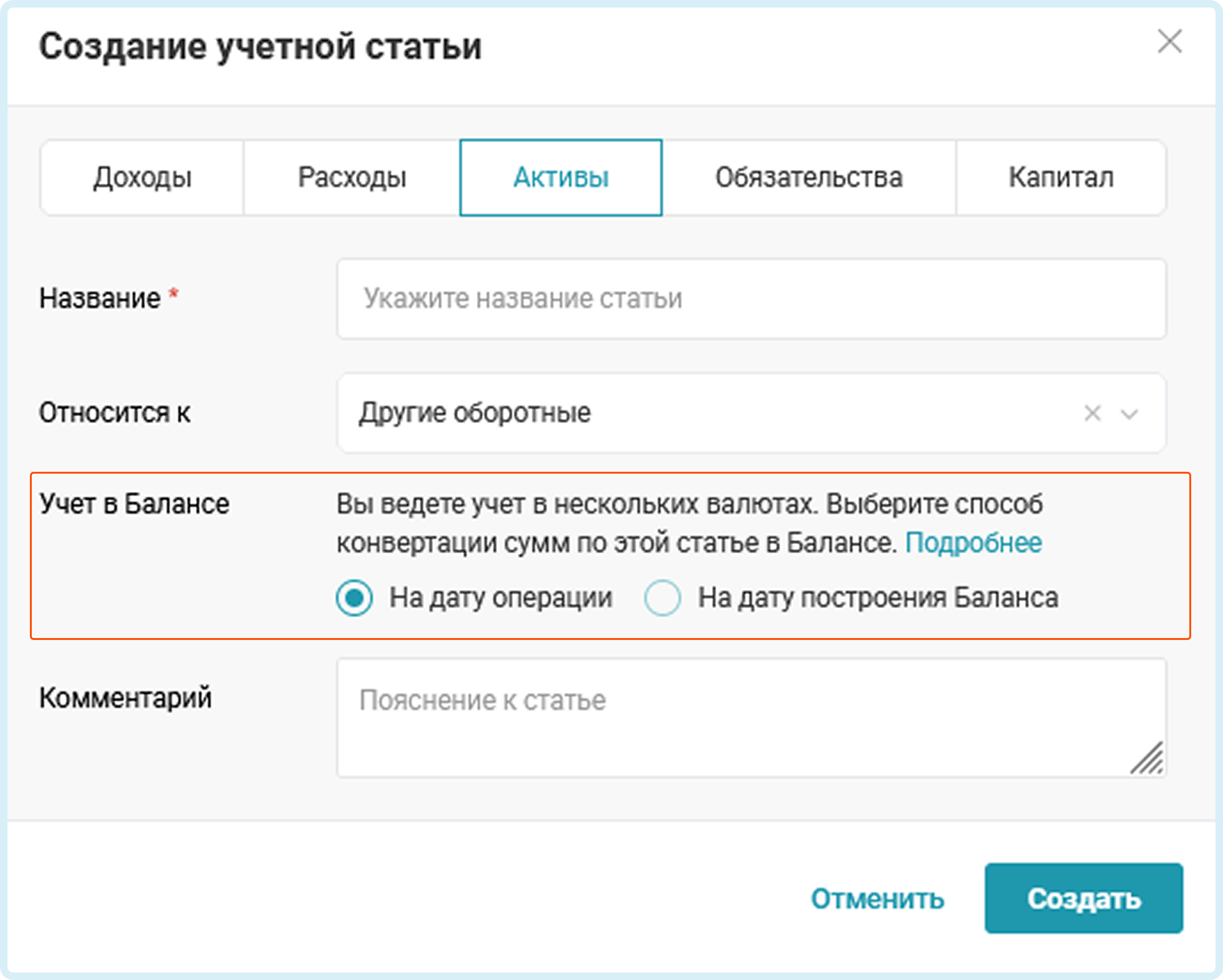 Для статей, относящихся к «Другим оборотным» активам и «Другим внеоборотным» активам, добавлена дополнительная настройка, обеспечивающая гибкость аналитики при мультивалютном учете. При создании или редактировании такой статьи можно выбрать в её настройках как будет происходить Учет в балансе: