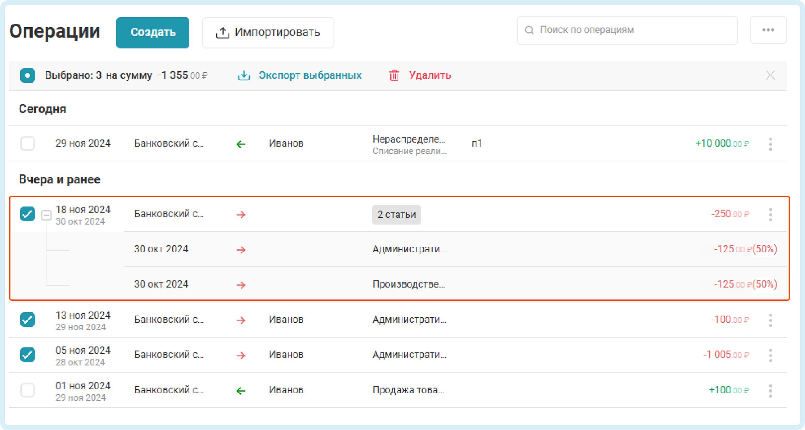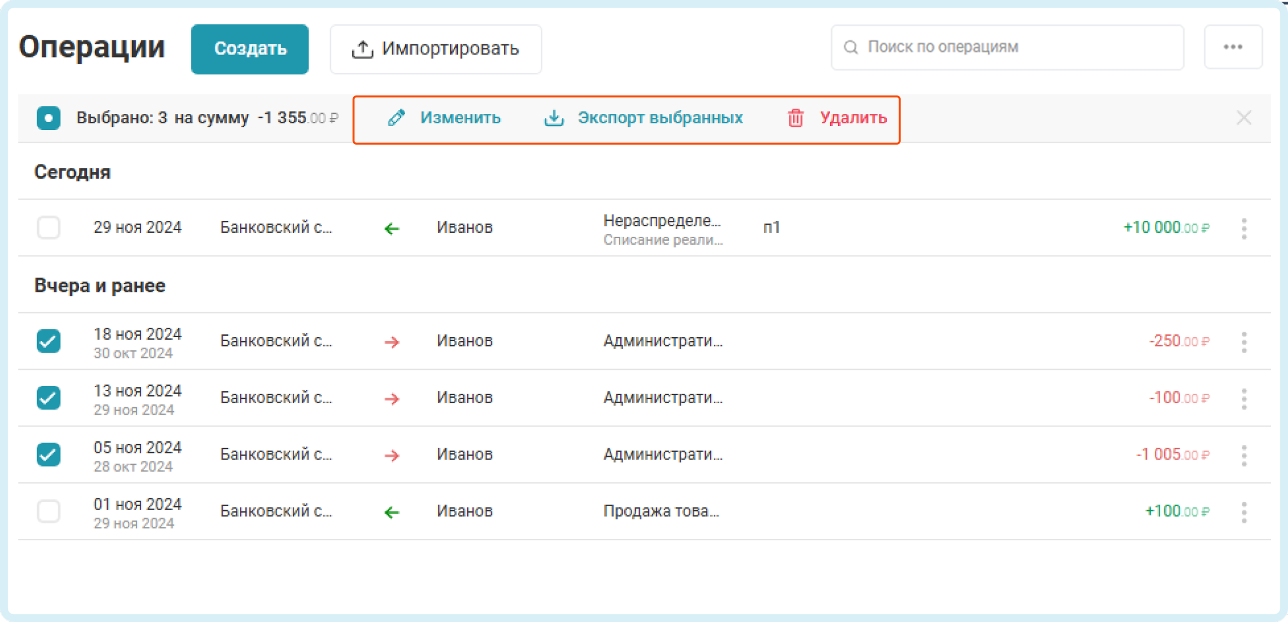 Отметьте в списке операций галочками те платежи, которые требуется изменить.