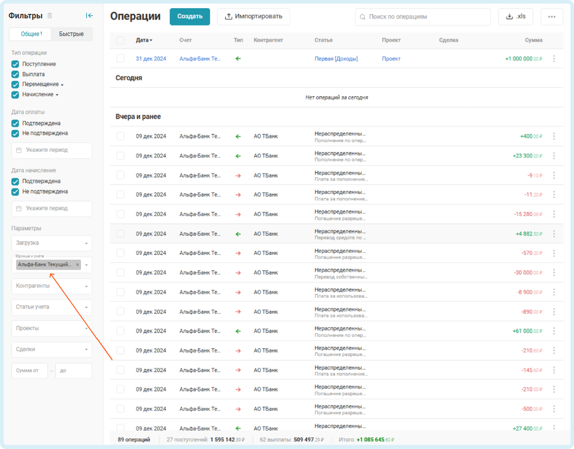 Если после проверки при помощи принудительной синхронизации сохраняется расхождение остатков в Дзен-Мани и ПланФакте, рекомендуем запросить в банке выписку в формате *.pdf и сверить вручную операции по списку. В ПланФакте перечень операции по счёту можно увидеть в разделе Операции выбрав в фильтре нужный счёт: