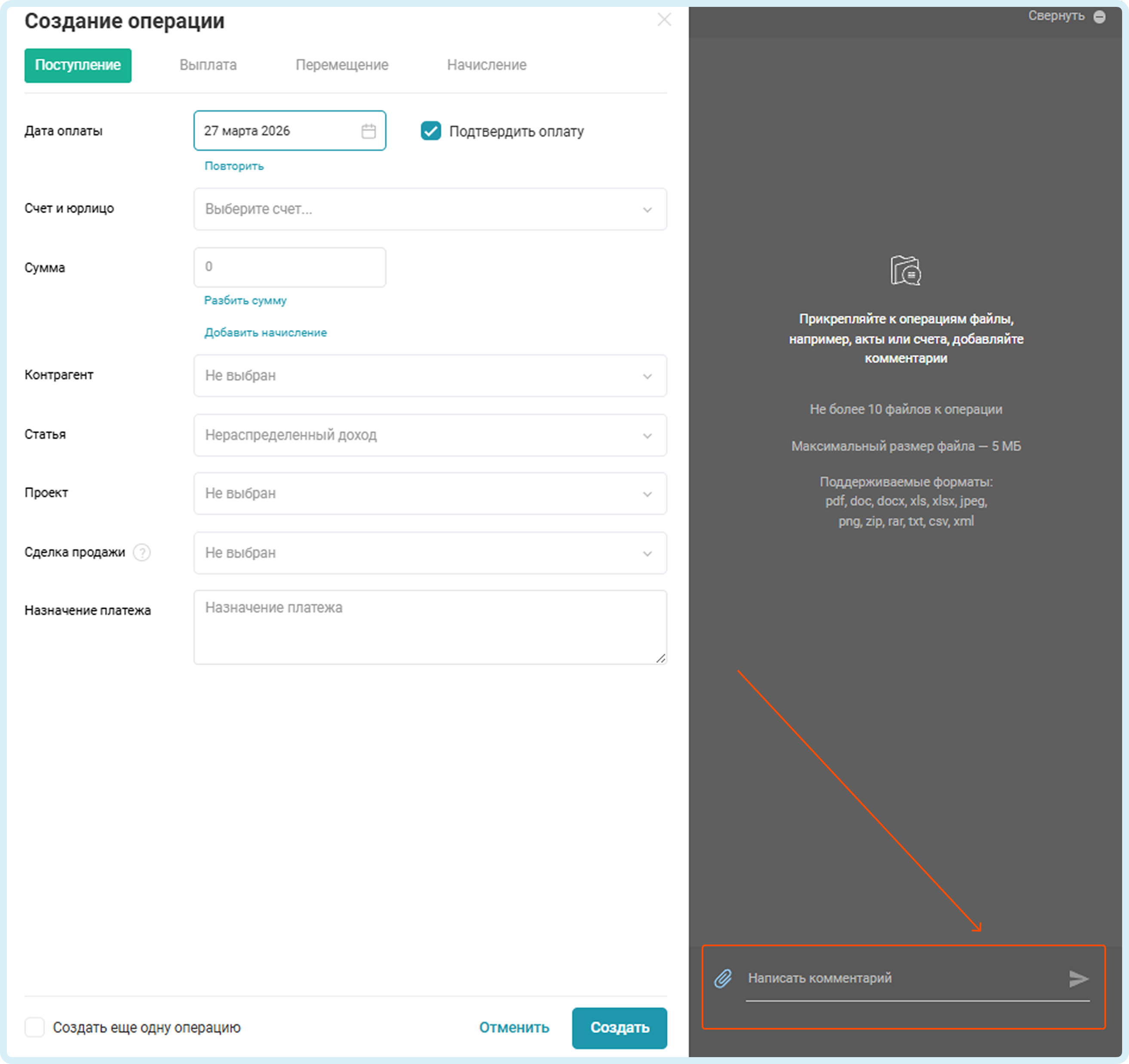 Объем файла не должен превышать 5 Мб, а к одной операции можно прикрепить до 10 файлов. Количество комментариев не ограничено.