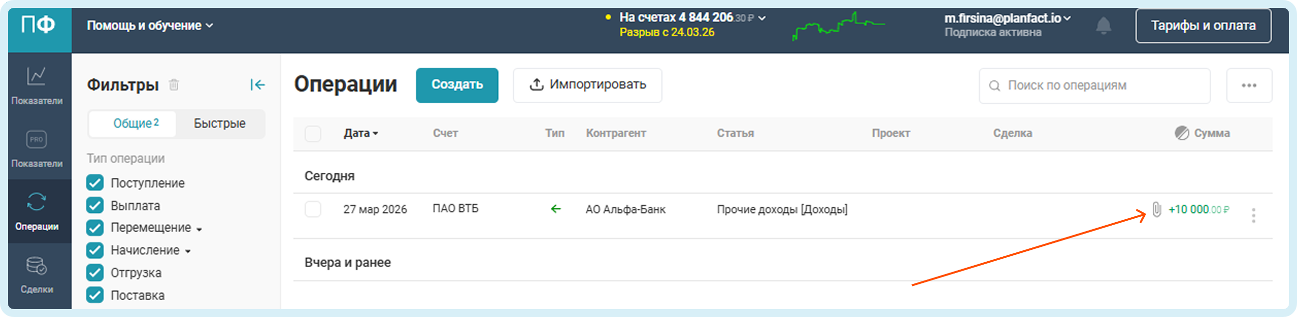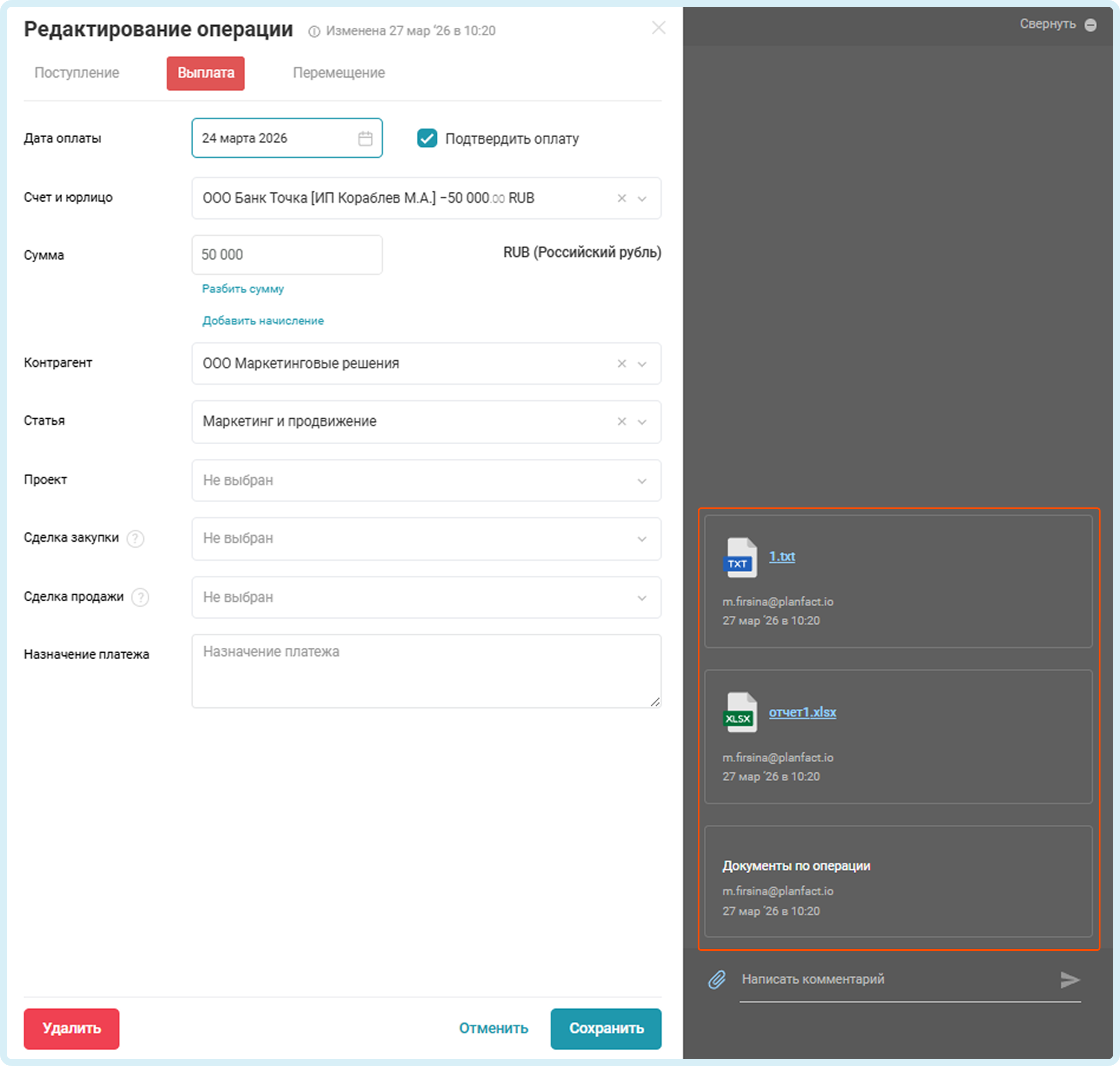 В ПланФакте появилась функция, позволяющая прикреплять файлы и оставлять комментарии к операции.