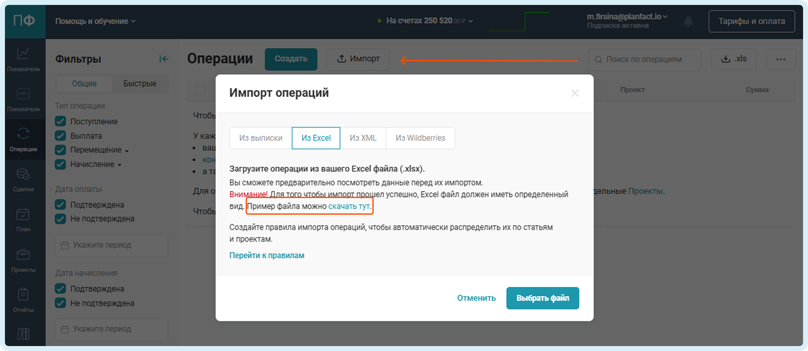 3. Данный файл нужно привести к формату, который распознает ПланФакт. Образец можно скачать в ПланФакте в разделе Операции - Импортировать - Из Excel, далее нажмите на ссылку "скачать тут".