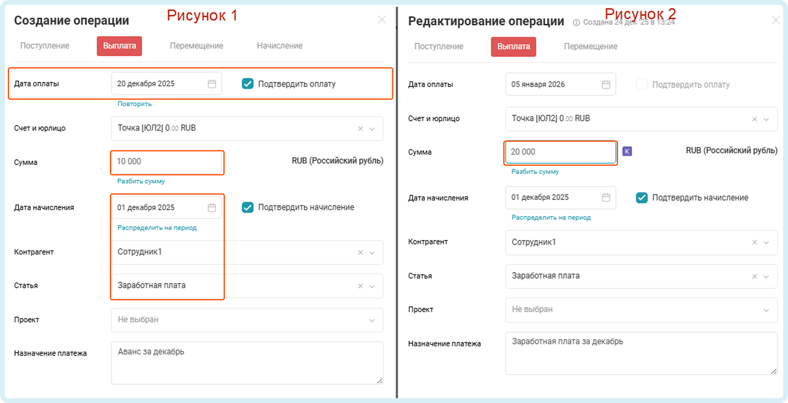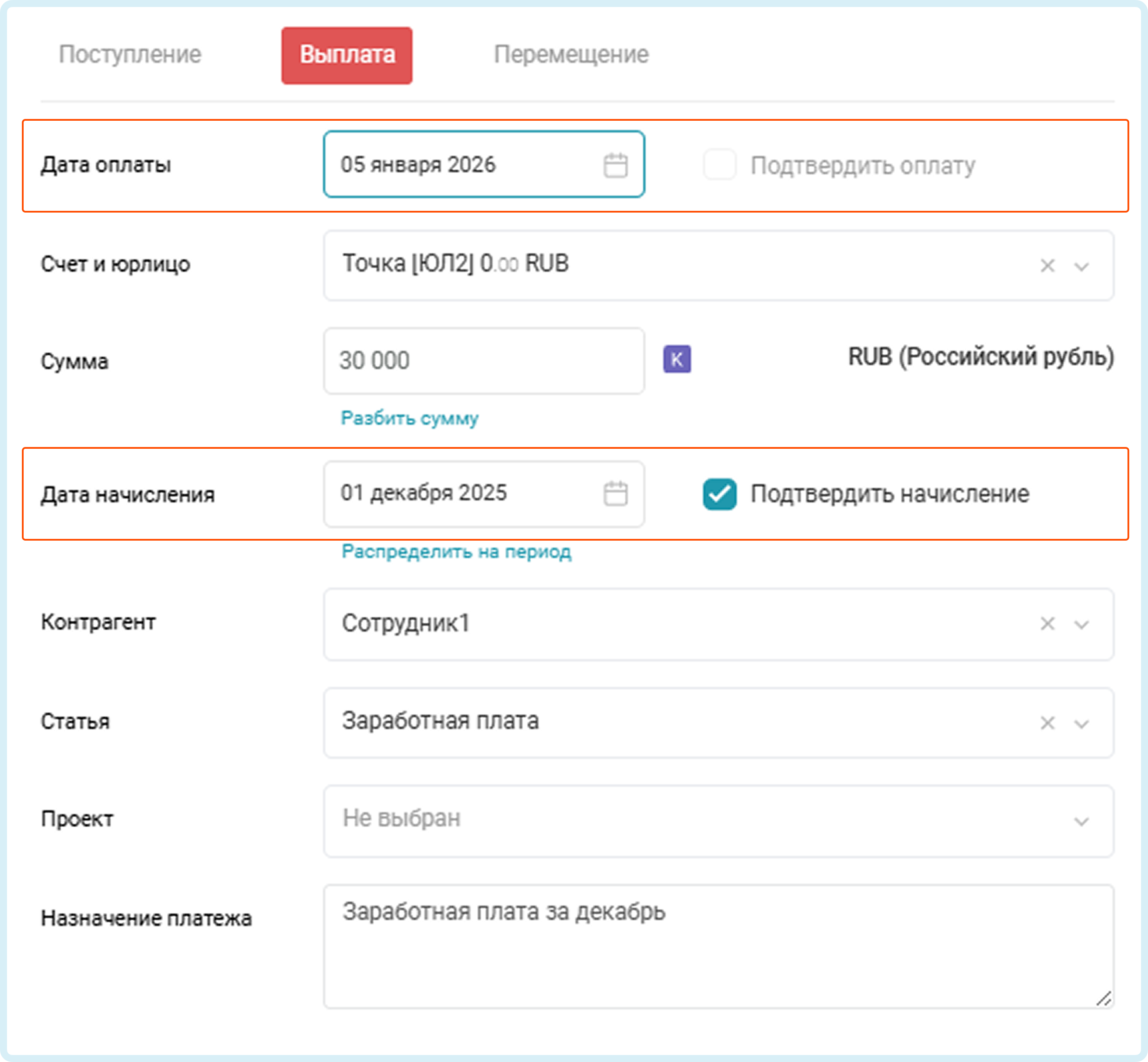 1. Сотруднику 1 декабря начислена зарплата за январь в размере 30000р. Создается операция Выплата по статье расхода Заработная плата. Оплата сотруднику будет проводиться 2 частями - 20 декабря аванс и 5 января остаток зарплаты. Поэтому в операции мы указываем дату оплаты 5 января - это дата полного расчета с сотрудником.
